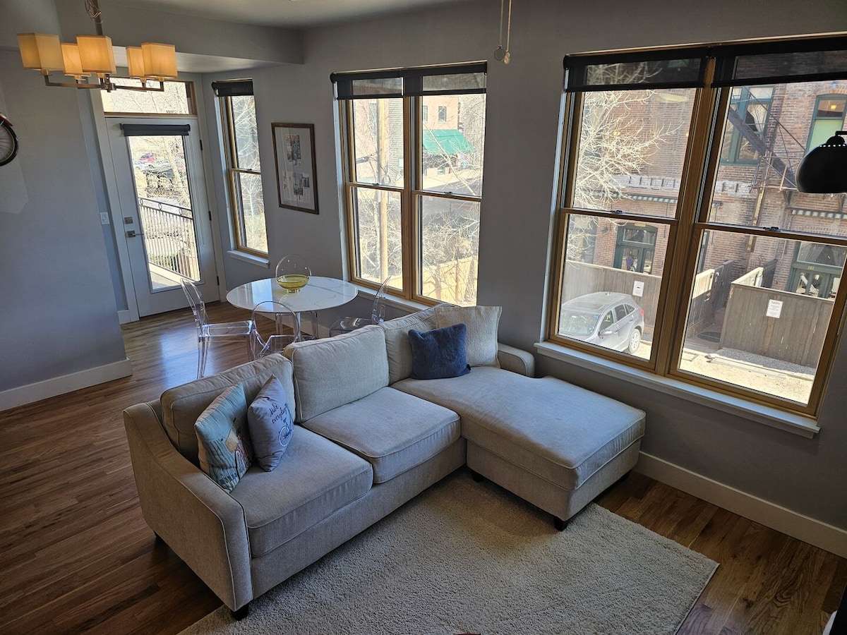 HEART OF DOWNTOWN 13 ft ceilings, 2 blks walk to RIVER!! AMAZING MOUNTAIN VIEWS!! HOT SPRINGS CLOSE BY! RIDE A BIKE ALL OVER TOWN. (If you rent monthly its APR/MAY/SEPT-NOV $2400,Winter $3000, Summer $3500). if monthly, No tax. Brick walls, HW floors 2 baths. 1 huge bedrm + set of bunkbeds + bath in 1 room, & 2nd set of bunkbeds on main floor w/ 2nd bath. restaurants/bars/shop/yoga right outside your door, or chill on the balcony. FREE PARKING SPACE! 1 PET ALLOWED