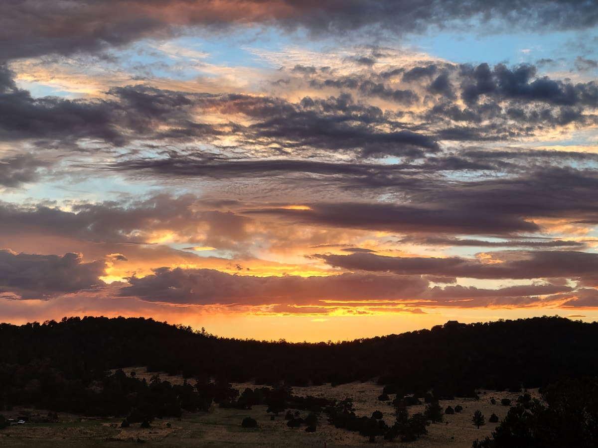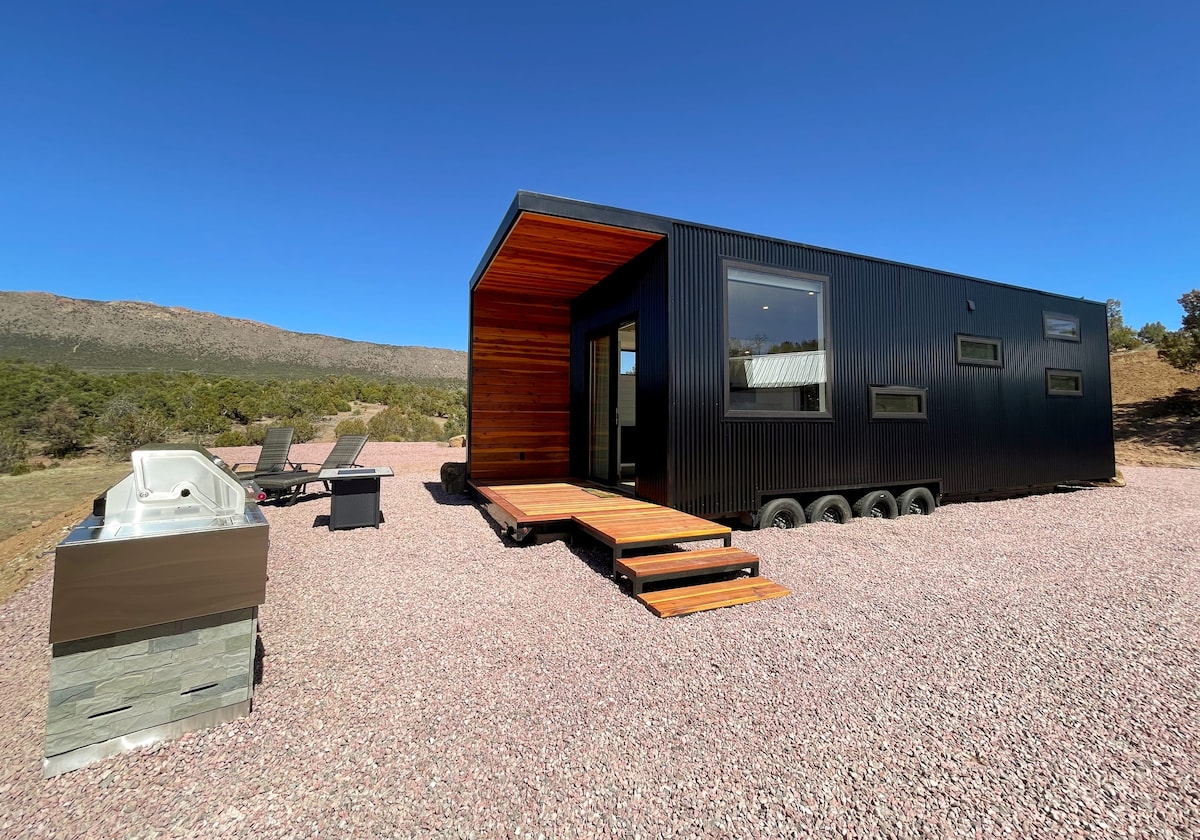The Peakview Cabin faces West, providing mountain backdrops and scenes of native pinyon pines and juniper for you to enjoy. Relax in the evening by the propane fire pit at your personal outdoor area in Adirondack chairs. The A-frame cabin features a cozy living area, a kitchenette, one bedroom, and private bathroom and shower. With one queen bed in the bedroom and a queen sized pull out sofa in the living room, we recommend the Peakview cabin for a maximum of 2 adults and 2 kids.