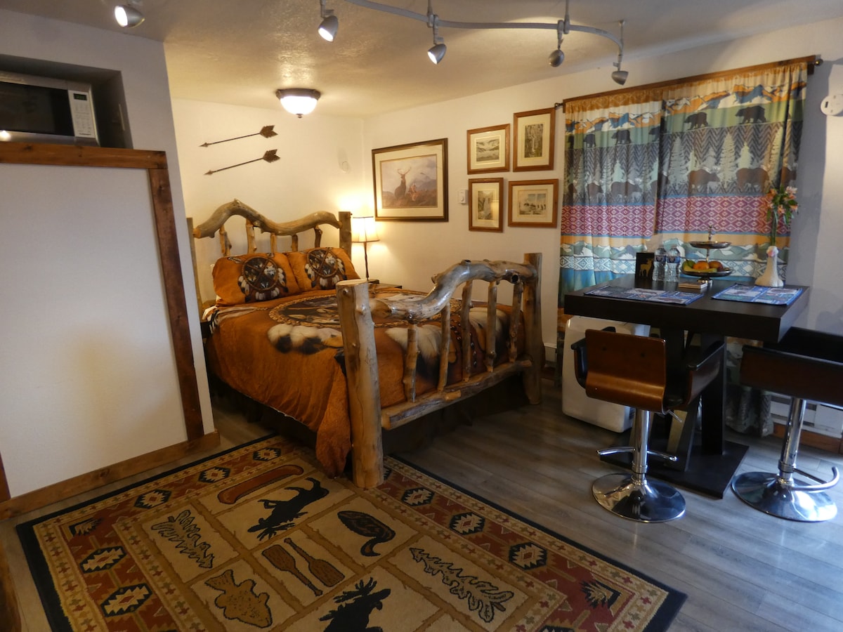 Located a mile (1.5 km) from Yellowstone Park, this studio has a small kitchen with a fridge, range, pots, pans and all you need for a self catering stay! Maximum of two guests! Sorry, no pets or cancellations, and NO KIDS UNDER 18, please! Please note check in time closes at 10 p.m.! Please see important information below, including that YELLOWSTONE IS CLOSED to cars in winter!