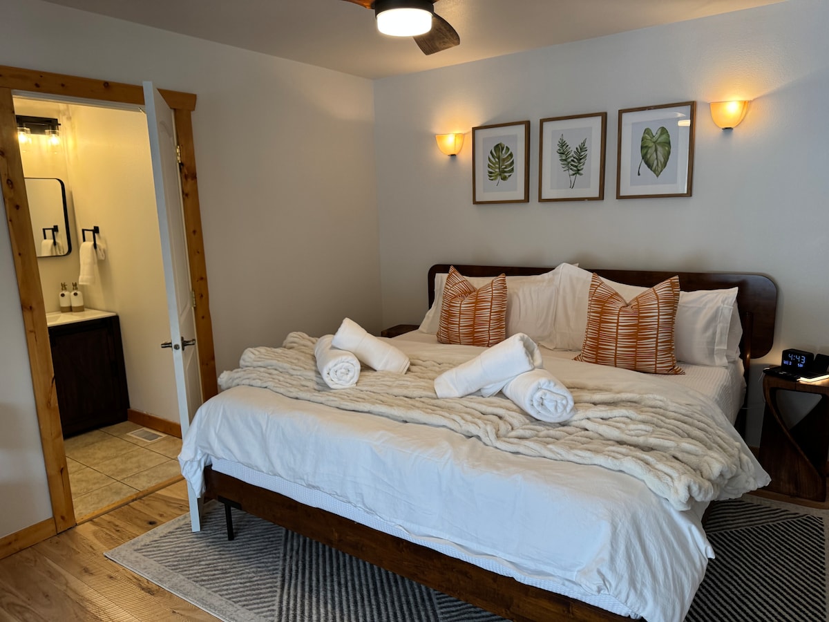 This newly remodeled 1930's Log Cabin comes with two bedrooms, one bathroom and can sleep up to six guests. Bedroom one has a king-size bed and bedroom two has a queen size bed. Additionally there is a queen sofa-sleeper in the living area. This listing also includes a washer and dryer, hangers and a hair dryer. This rental also comes with a fully equipped kitchen, refrigerator, four burner-electric stove, microwave, two drawer dishwasher and coffee maker. Free coffee filters, coffee & tea.