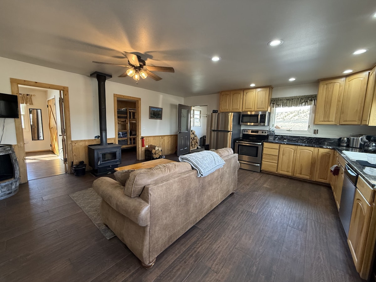 Riverbend cabin was a new build in 2020 on the banks of Pine Creek. The open-concept living area has a tv, sitting area, gas fireplace, murphy bed, small dining area, and a full-size kitchen. The master bedroom has a king-size bed and a small closet. The large covered back deck is the perfect place to enjoy a meal or simply relax and take in the view. We are just outside of the city limits yet very close to town. Enjoy the peace and quiet while being close to all Pinedale has to offer!