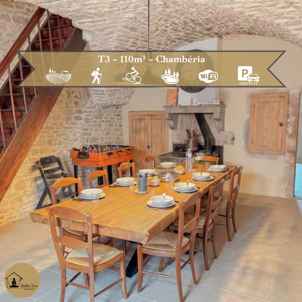 Chaleureux corps de ferme de 220 m², classé meublé de tourisme *** , situé entre le lac d'Annecy et Albertville : idéal pour se détendre, à proximité de sites attractifs variés. A quelques minutes à pieds : départs de randonnées, plan d'eau aménagé, piste cyclable Albertville/Annecy, rocher d'escalade, restaurants et boulangerie. A 1/4 d'heure en voiture : lac d'Annecy, cinéma, parapente, et tout commerce utile. A moins de 45 minutes : stations de ski, Annecy, Albertville, Conflans, etc.