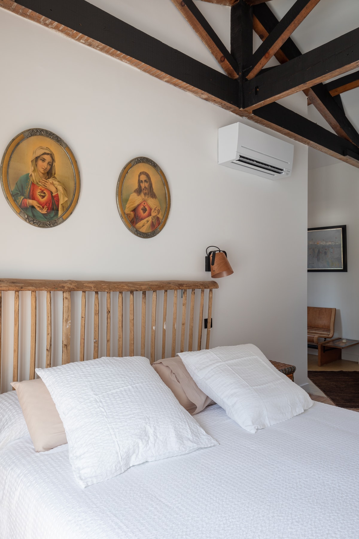 15 to 18sqm Room perfectly designed for a comfortable stay for two people. The rooms have a subtle seventies vibe in their proportions, colors, shapes, and wall decor, with a touch of California as well. However, Alfred Hotels leaves its signature mark: simplicity, comfort, timelessness, softness, and craftsmanship. The wall tapestries, designed by Inez Prat, evoke the landscapes of the Atlantic coast, from Galicia to the Basque Country.