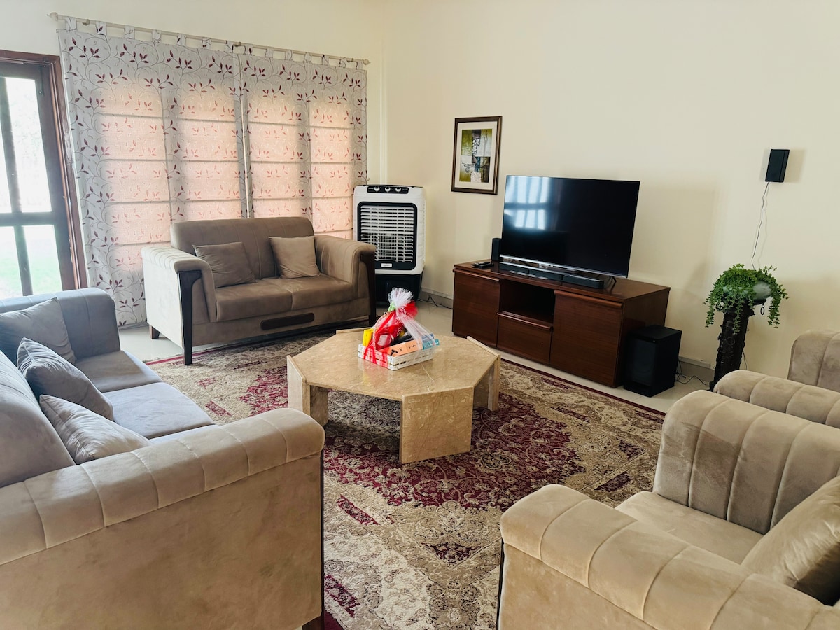 Unwind with Your Family in Our Serene 3-Bed Apartment Escape to our cozy 3-bedroom apartment. - 3 Spacious Bedrooms: 2 master bedrooms with king-sized beds, AC, and smart TVs. One room has a stylish dressing area, third room has single bed, cupboards, Iron stand, dressing table & no Ac. - Amenities: Attached washrooms, 3 shaded LED lighting. - Drawing Room: 5-seater sofa, attached washroom. - Kitchen: Spacious American-style with dining table and brand-new appliances. Unit on 2 floor no lift