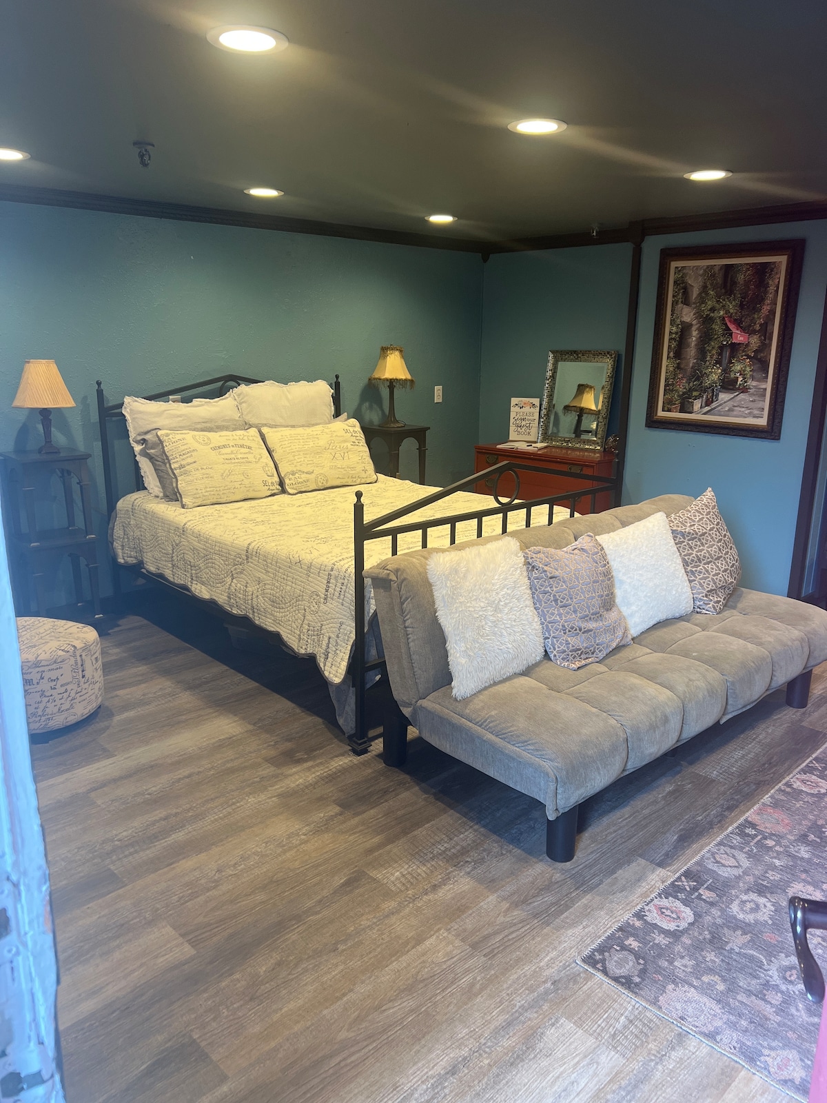 The Fiddlehead Suite is our smallest suite but makes up for it in character. This cozy suite is an eclectic mix of antique history and modern luxury. It is outfitted with a luxurious king-size bed and organic cotton linens, as well as a smart TV and high-speed Wi-Fi for your convenience and comfort. The Fiddlehead also boasts an ensuite bathroom with a full soaking tub/shower, plush organic cotton towels, and unlimited hot water.