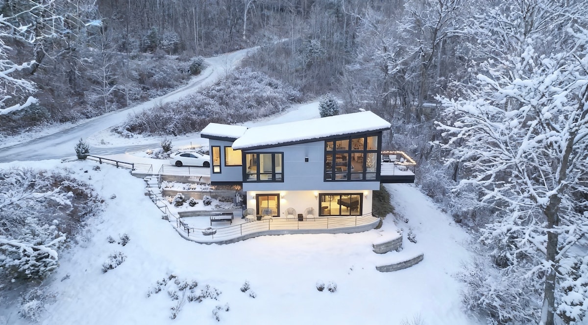 Winter at Cloud 9 is pure mountain magic. Cozy up by the gas fireplace as snow clouds drift past floor-to-ceiling windows framing million-dollar views of rolling valleys and peaks. Unwind in the spa-like primary bath with a deep soaking tub and walk-in rain shower—warm, indulgent, and serene. Step onto the expansive back deck for fireside marshmallow roasting beneath crisp mountain skies. A luxurious, peaceful, and pet-friendly retreat with blazing-fast internet. Book your stay at Cloud 9 today