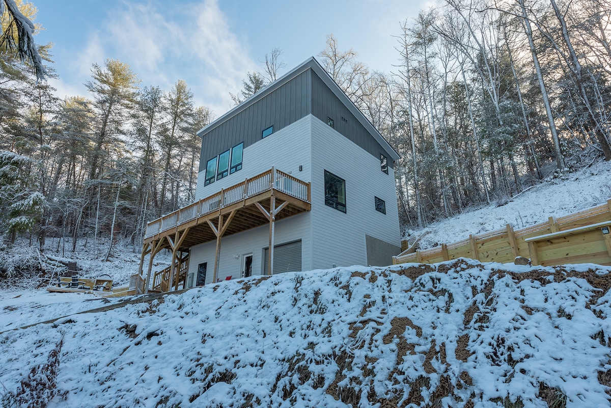Where luxury + mountains meet! Explore the rugged & refined nature of Asheville from this new private vacation rental home, a perfect escape for a romantic getaway or small group gathering. Sophisticated style, luxurious comforts, hot tub, EV charger, fully equipped kitchen, wood-burning fire pit, 3 miles to the heart of downtown. Sip your morning coffee on either deck, take a drive on the Blue Ridge Parkway then head downtown for a drink at a brewery & return to the hot tub under the stars
