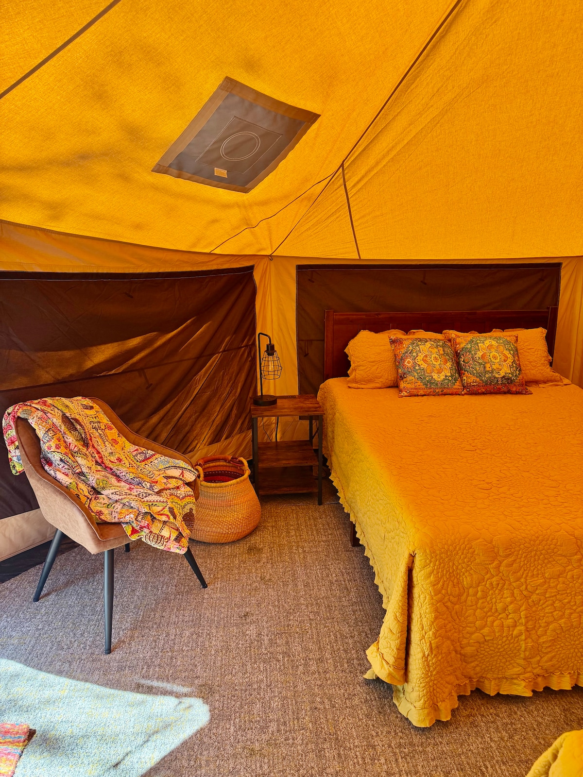 Come stay in our handcrafted glamping tent, built with traditional timber-frame joinery and wrapped in the beauty and whimsy of breathable cotton canvas. Breathe in. Draw near. Be still. Watch morning mist drift through the valley from your front porch. Take a nap as sunlight dances across the canvas. Soak in the sounds of birdsong and breeze while reading a good book. Nearby adventures: 15 min – Indian Mtn. Park 40 min – Norris Lake 45 min – Cumberland Falls 2 hr – Great Smoky Mtn. Ntl. Park