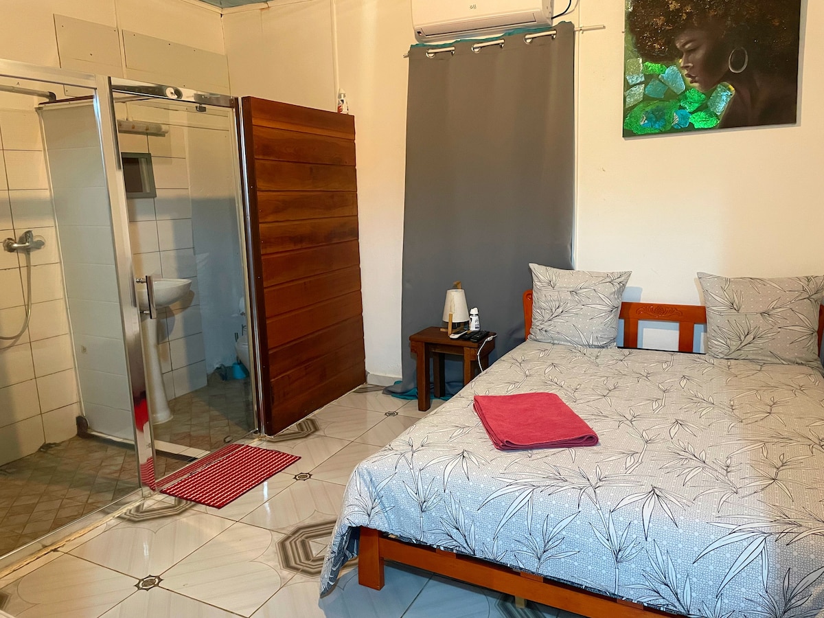 Situé à 5 km du centre ville de Cayenne, dans un quartier résidentiel de Remire Montjoly et à quelques mètres de la plage. Cette chambre d’hôte vous apportera tout le confort et le service d’un 4 étoiles. Composée d’une immense salle de bain avec douche à l’italienne, sèche cheveux, peignoir, savon La chambre de 35 m2 est équipée de 2 grands lits de 2 places, d’un téléviseur, d'un mini-bar, d’un bureau, de la wifi, d'une planche et fer à repasser, d'une machine à café.