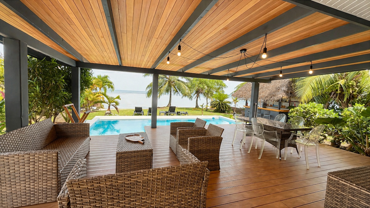 Villa au bord de l'eau avec piscine et vue sur Bora Bora, côté coucher de soleil, avec grande terrasse de 50m carrés, bar privé dans le jardin. 2 chambres climatisées Nous mettons à disposition et gratuitement : 1 kayak simple 1 kayak double 5 vélos standards