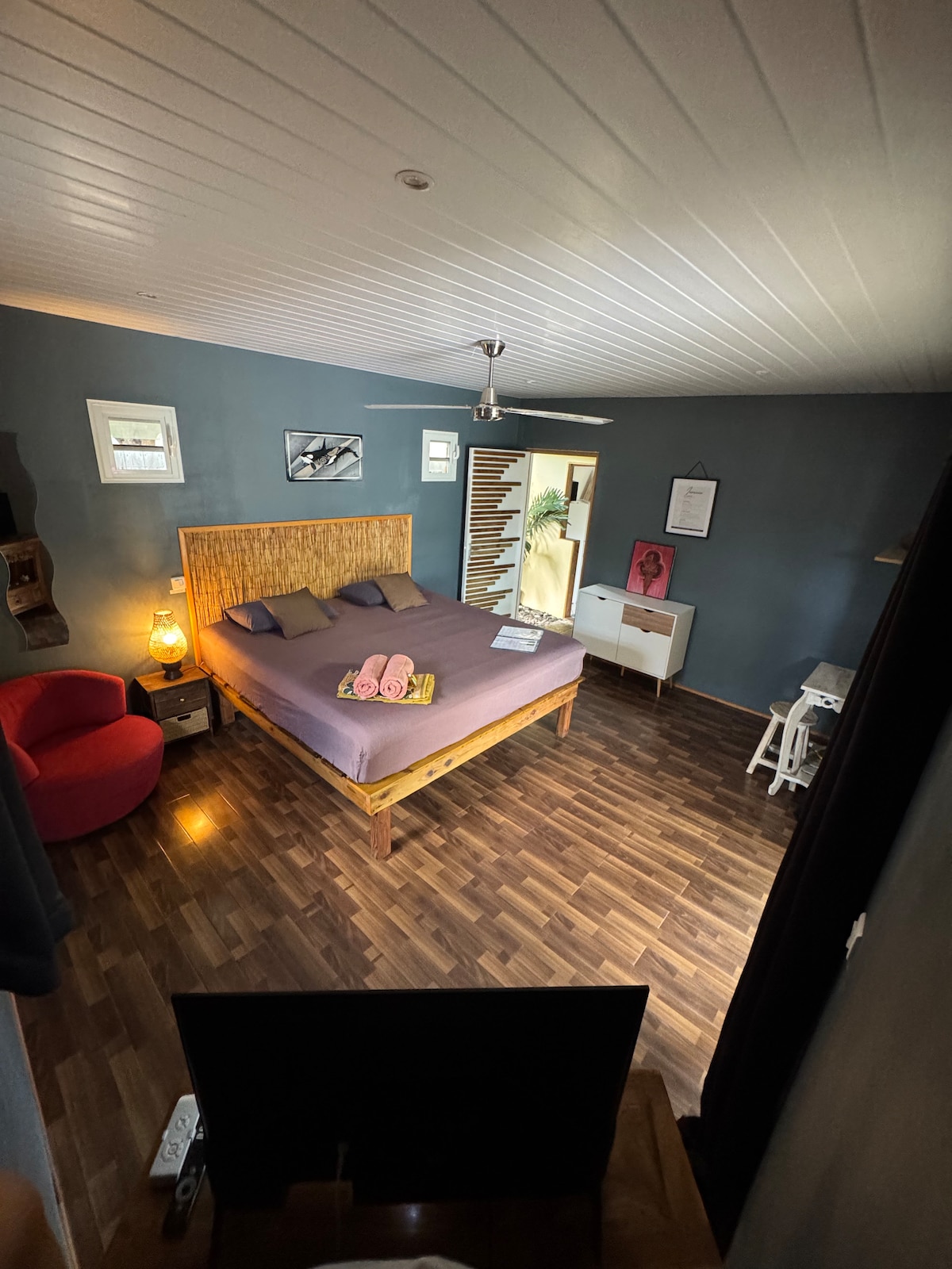 Our charming 85m² house and its 22m² terrace offers you a breathtaking view of the magnificent island of Moorea. You can relax in comfortable spaces, while having the possibility of working thanks to a motorized desk and a second screen for a dual display with your laptop. The good internet connection will allow you to stay connected to your work. Come and live a unique experience in this house where comfort and vacation go hand in hand.