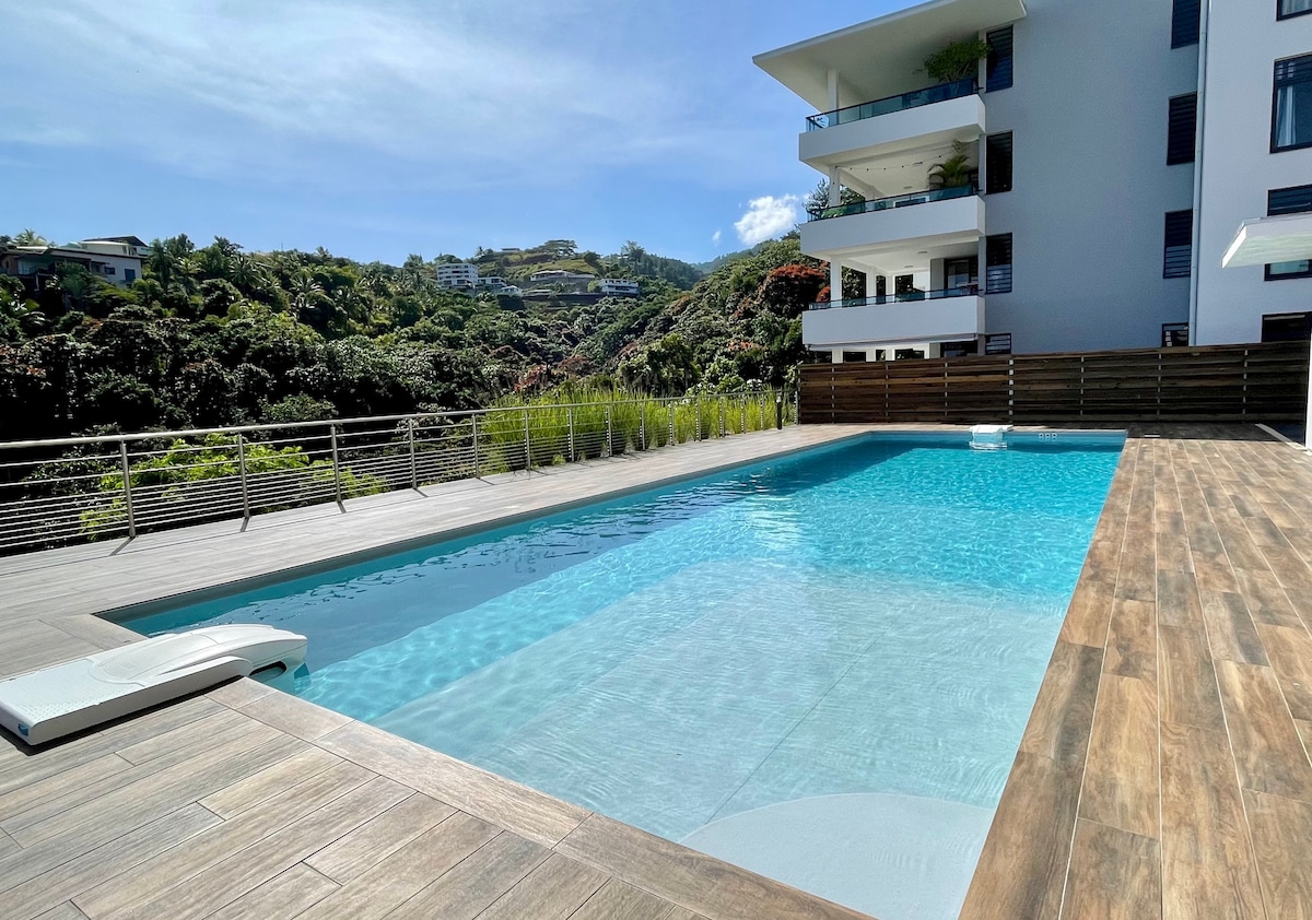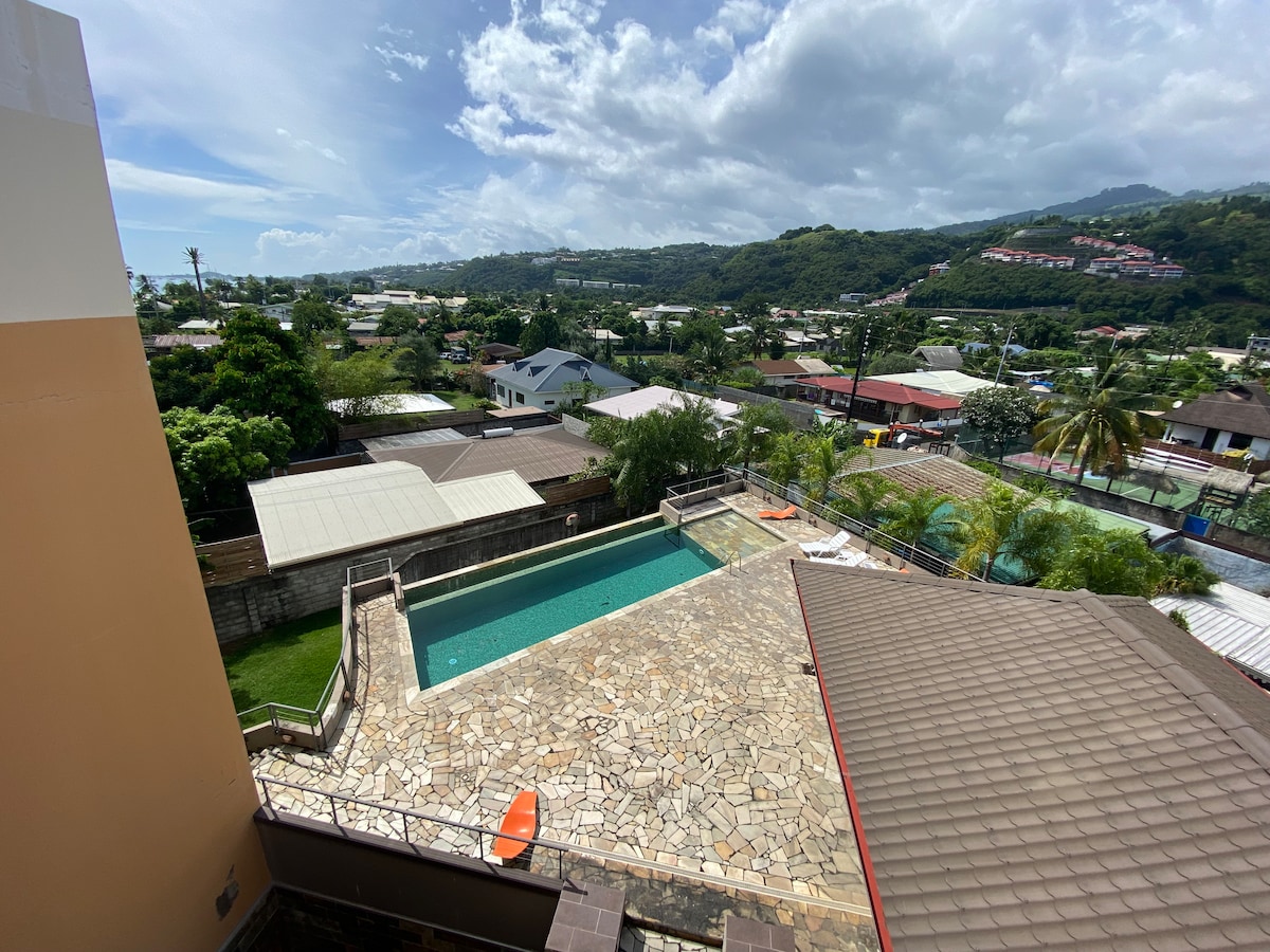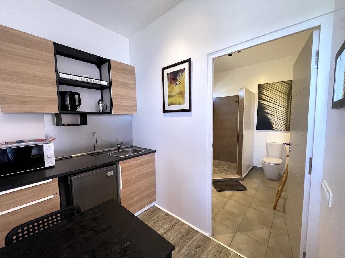 Prenez de la hauteur et découvrez ce magnifique studio tout équipé avec vue sur le lagon et piscine. Le logement est climatisé, vous pourrez profiter de votre cuisine privée et votre salle de bain atypique à ciel ouvert Le studio est situé chez le propriétaire en prolongement de la maison, qui vous assurera une parfaite intimité.