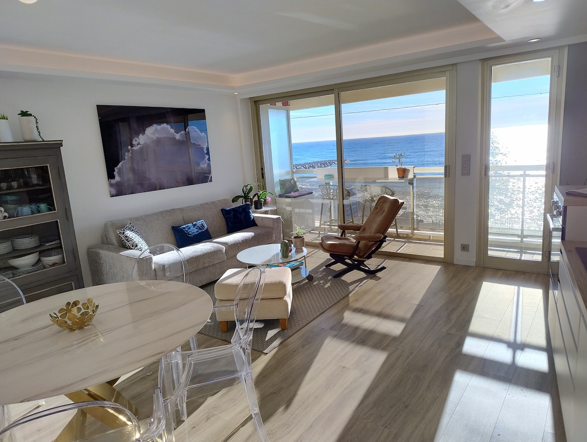 « SEAVIEWS BY JENNI MENTON »présente: Superbe 2 Pièces NEUF en Front de Mer, sur la Promenade du Soleil. 50 m2 de design,large terrasse de 18m2, vue mer comme sur un bateau de tout l'appartement. Conçu pour le confort de 4 personnes. Décoration très recherchée,matériaux et équipements haut de gamme. GARAGE FERMÉ* ASCENSEUR CLIM SMART TV INTERNET ILLIMITÉ HAUT DÉBIT ENCEINTE BLUETOOTH BOSE A quelques minutes à pied de tous les commerces et activités. Bus en bas de la résidence, gare à pied.