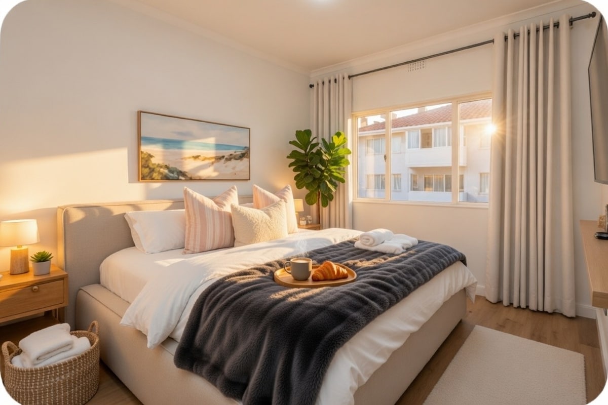 This incredible 2 bedroom apartment offers breathtaking views over both ocean and mountains. It is centrally located near several beaches, restaurants and shops, and is a perfect home for families, couples or business travellers looking to stay in a comfortable, beautiful space. Enjoy breakfast or sundowners on the spacious balcony after a cooling dip in the pool, while preparing your food on the barbecue or in the fully kitted kitchen. This penthouse comes with free parking and fibre internet.