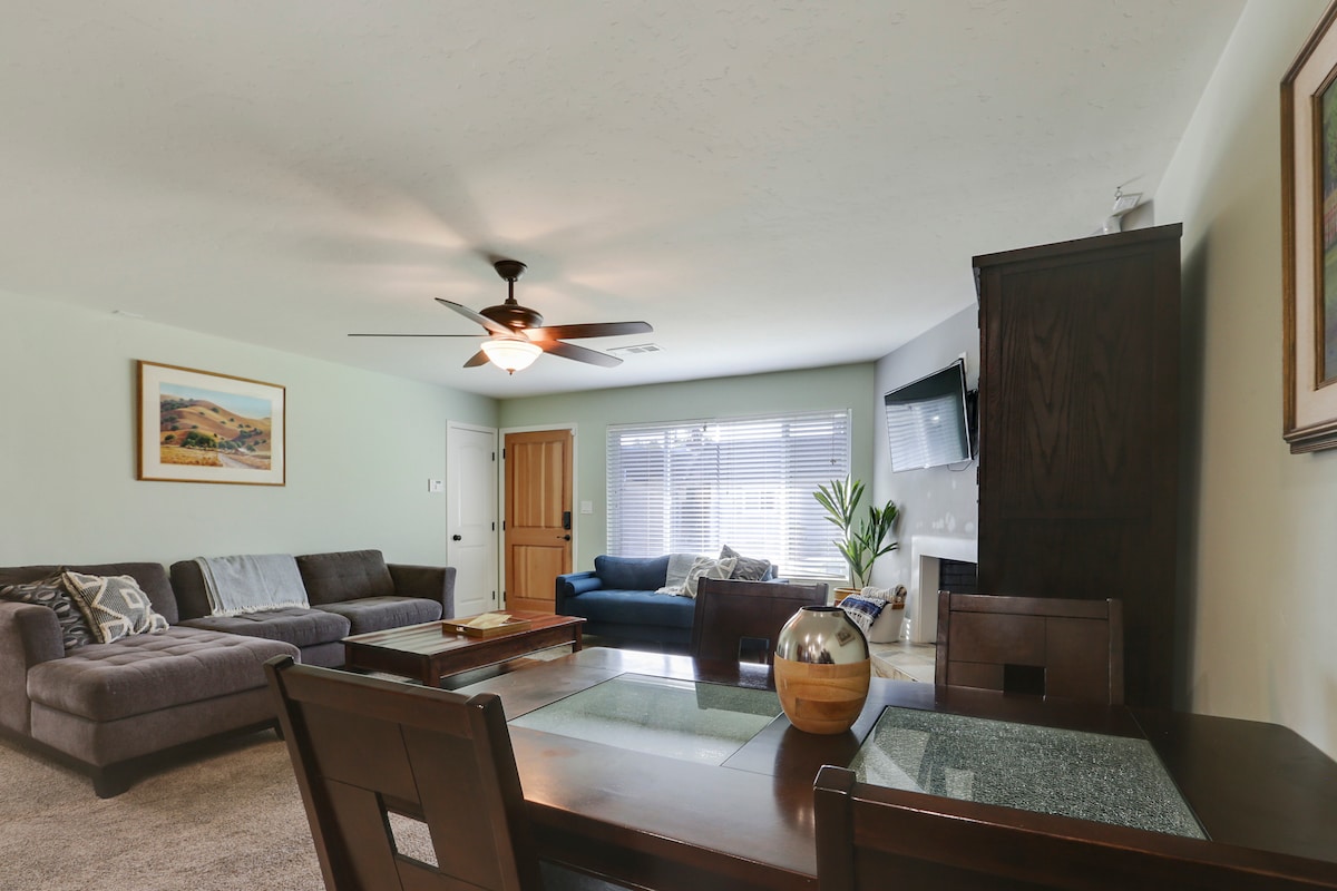 Enjoy a luxurious fully remodeled 2 Bedroom / 2 Bath / home w/office/den, private yard, new kitchen, stainless appliances, washer/dryer and oversized private garage. This modern haven is in the heart of Northwest Fresno. Walk to River Park & Villagio Shopping Centers for dining and fun and hike nearby trails at Woodward Park. This is your home away from home. Perfect for extended stays, solo travelers, families, friends, and couples seeking a sanctuary with easy access to local attractions.