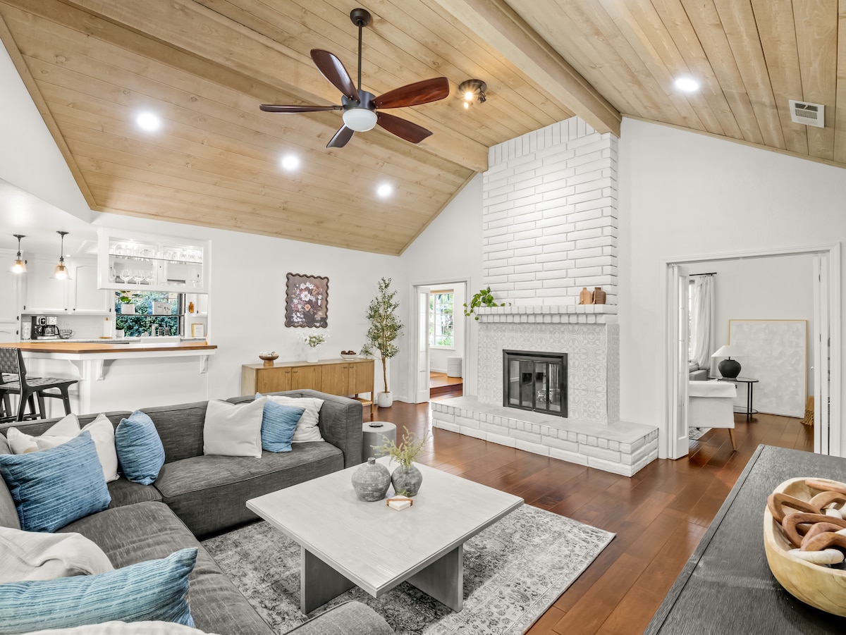 This modern, recently remodeled home is perfect for groups or housing out of town family, and offers a peaceful outdoors. Lounge in the hot tub under the old wisteria tree in the garden, cool down in the pool or chill on the comfy couch. Sleeps 10 comfortably, up to 16 using the spacious den. Chef's kitchen includes William's Sonoma cookware, 6 burner range. Linens/towels, kitchen basics, air mattress, pack n' play & high chair. Two desks & docking stations. WiFi. Dogs welcome with doggie door.