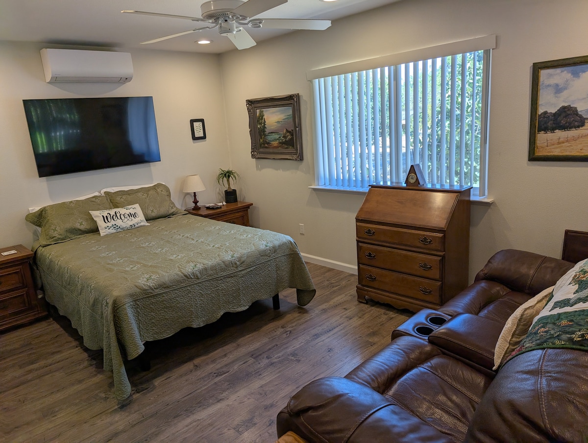 Our huge 825 sq foot guest suite is the perfect location to recharge. You’ll feel like you’re at a country retreat yet only a few minutes drive to shopping and freeway access. Relax in the jet tub or scrub away your worries in a gigantic shower. Enjoy your morning coffee on the patio listening to the birds chirp or watching the gorgeous sunsets. Our beautiful suite offers it’s own office space, table, couch (convert fee) , a comfortable Queen bed, and ample parking too! ID required prior arrival