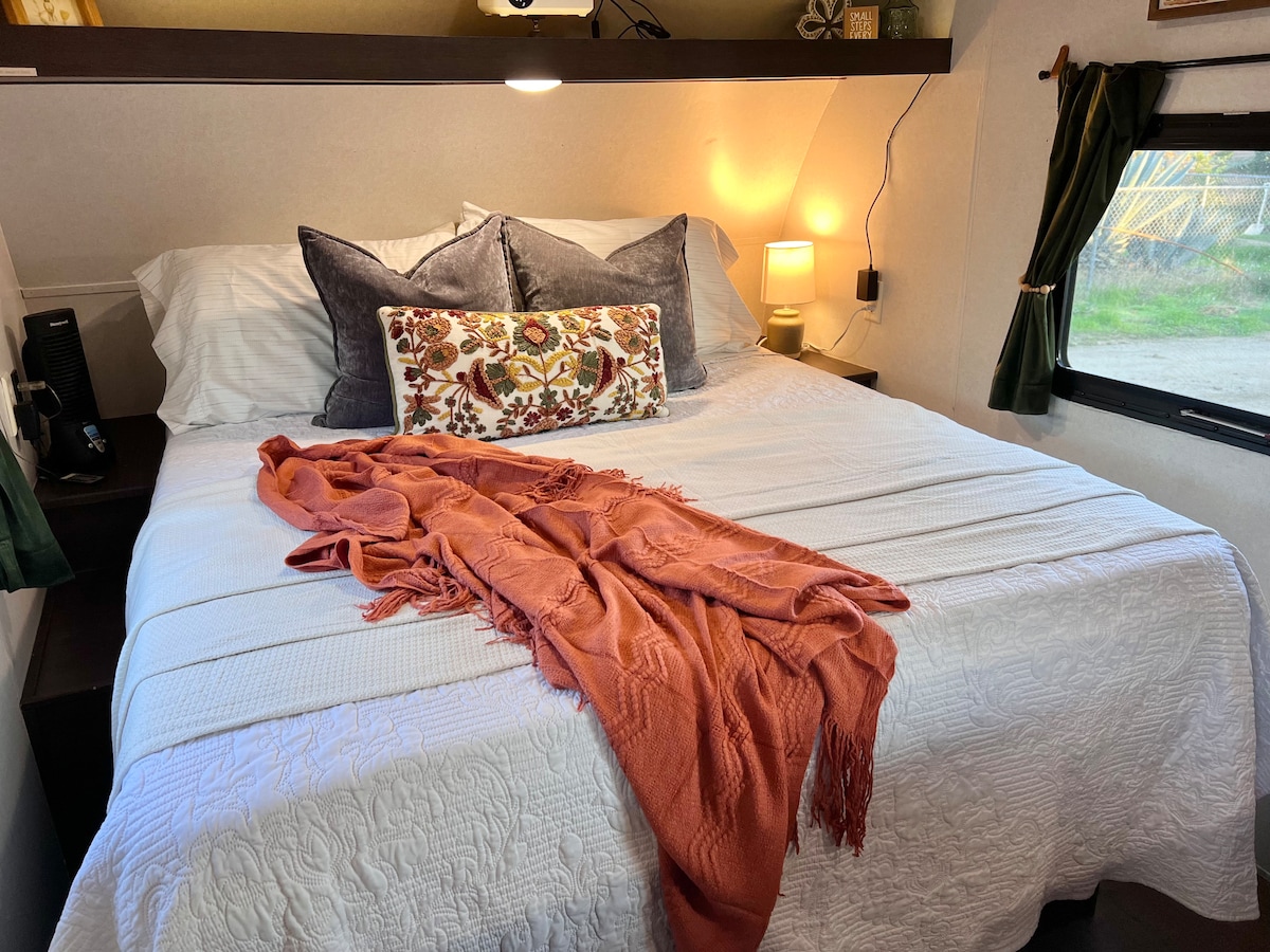 Retreat and unwind at our cozy camper after a day exploring the city or hiking in Sequoia/Kings Canyon National Parks. You will enjoy a fully equipped camper with a full bath, kitchen, dining space, and 76" queen bed. Indulge in a movie or TV show on the pull-down projector screen from the comfort of bed! The overhead A/C unit will help you beat the heat as you relax in the comfort of the camper. Message if interested in staying over 30 days. See pet policy under "Additional Rules." No smoking.