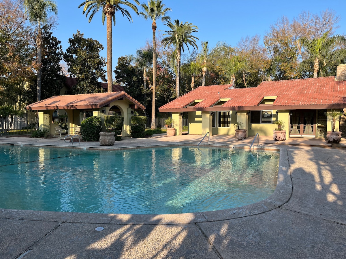 Take it easy at this tranquil 2 bedrooms-1baths Condo in a beautiful oasis gated community. Located Downtown Fresno, 2 blocks walking distance to CRMC, 10 mins drive to St. Agnes & Kaiser, 12 mins to Clovis Community Hospital, 15 mins to Valley Children Hospital. Walking distance to Starbucks, Grocery Outlet, IHOP, Amtrak, Etc. If you are in Fresno/Clovis to visit your Love-Ones, a Traveling professional, this is a safe, private, quiet place to rest, work & unwind. Enjoy the gym, swimming pool.