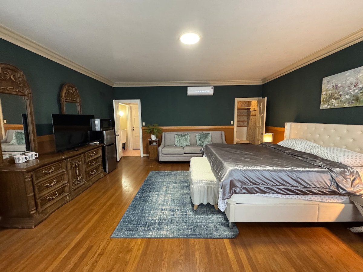 Perfect getaway for family holidays, reunions, company retreats, and work-crews. Escape to the countryside in our 5500 sq. ft modern farmhouse, surrounded by 40 acres of serene, cherry blossom like Almond trees. Enjoy fresh county air and put your mind at ease. Access all the amenities including 2 large living rooms with 85 inch and 70 inch TVs, fully equiped kitchen and comfortable bedrooms. Two bedrooms connected by closet and hallway. One bedroom connected to master bedroom via sliding door.