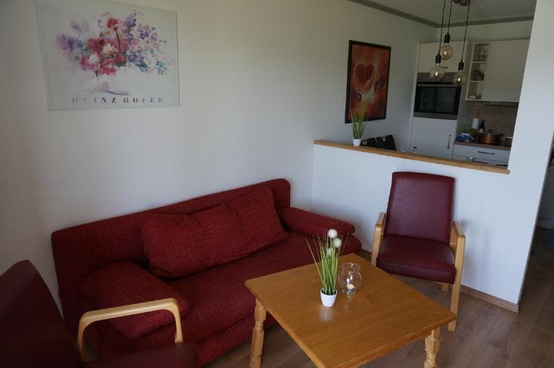 Our apartment, fully renovated in 2023, offers 35m2 of space for up to 3 people. Bathroom with shower, WC, hairdryer and 1x towel per person; living/dining/sleeping area: Double bed 180x200 cm, bed linen available, pull-out sofa bed, bed linen available; SAT-TV; fully equipped kitchen; SOUTH-facing terrace with table/chairs as well as small conservatory in the entrance area; free W-LAN; Laundry rack, iron/ironing board and cleaning utensils; NON-SMOKING APARTMENT - smoking possible outside
