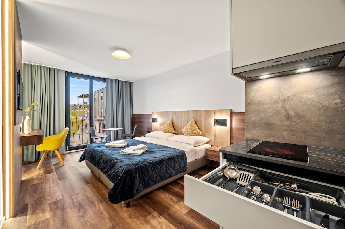 A modern studio with kitchenette, 2 single beds, dining table, chairs, TV, wifi, shower, toilet. This category is ideal for 1 person and can accommodate up to 2 people.