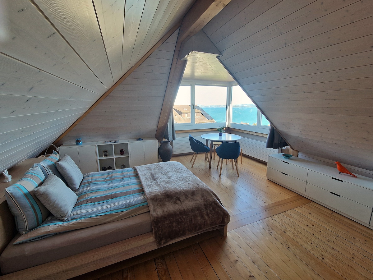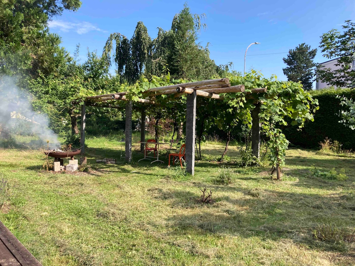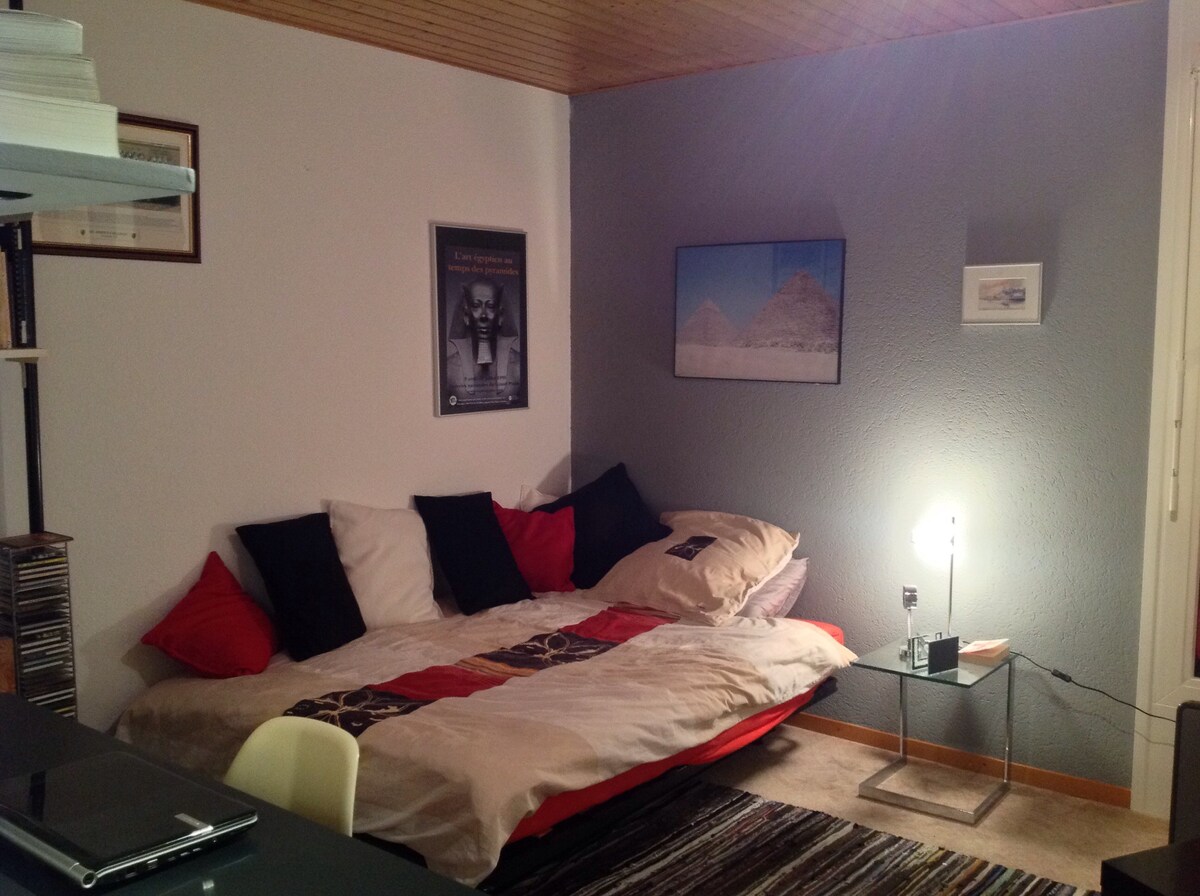 Vous pourrez vous détendre dans le confort et le calme tout en étant à la fois tout près de la ville et du lac. Dans un quartier tranquille, une suite chaleureuse avec une magnifique vue, chambre spacieuse avec un lit double 160x200, salon séparé avec un canapé convertible en deux couchages 90x200 dont un mobile, jardin et place de parc privée. A 5 minutes à pied d'une gare, des lignes de transports publics et à 20 minutes de marche du centre ville. La plage est à 10 minutes à pied de la maison.