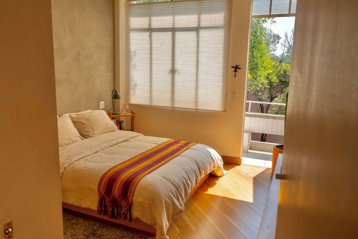 Cozy and spacious new apartment in cobbled street of the most traditional neighborhood of the area. Full of light and tranquility. Beautiful private terrace. Less than 10 minutes walk from the historic center of Coyoacan and 50 meters away of the Viveros de Coyoacan National Park.