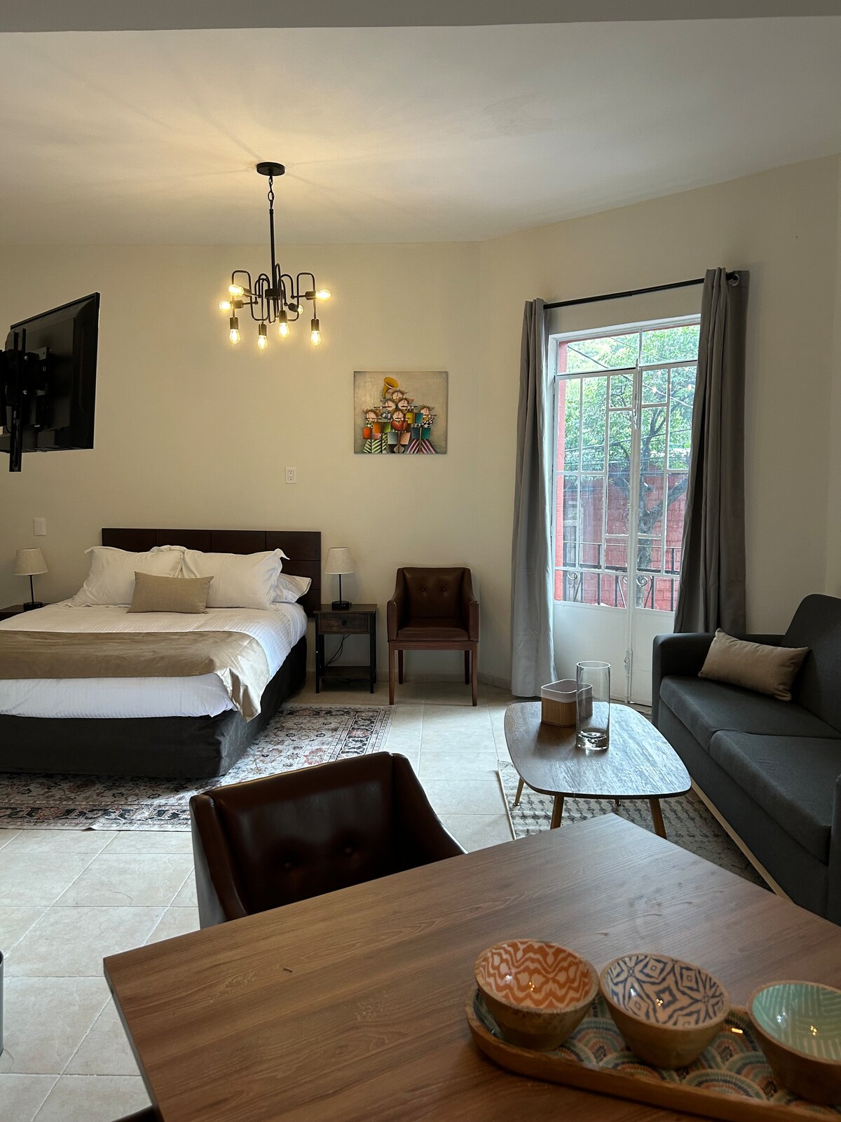 Brand new and cozy one-bedroom apartment located walking distance to Frida Khalo's house in the traditional neighborhood of Coyoacan. 20 min uber to World Cup’s Banorte Stadium. The apartment overlooks a small garden on the front and a large one on the back. It is quiet, nicely decorated, bright, and has all the amenities you need for a pleasant stay in CDMX. It is within a short walk to restaurants, bakeries, coffee shops, plazas, museums, galleries, theaters, and more.
