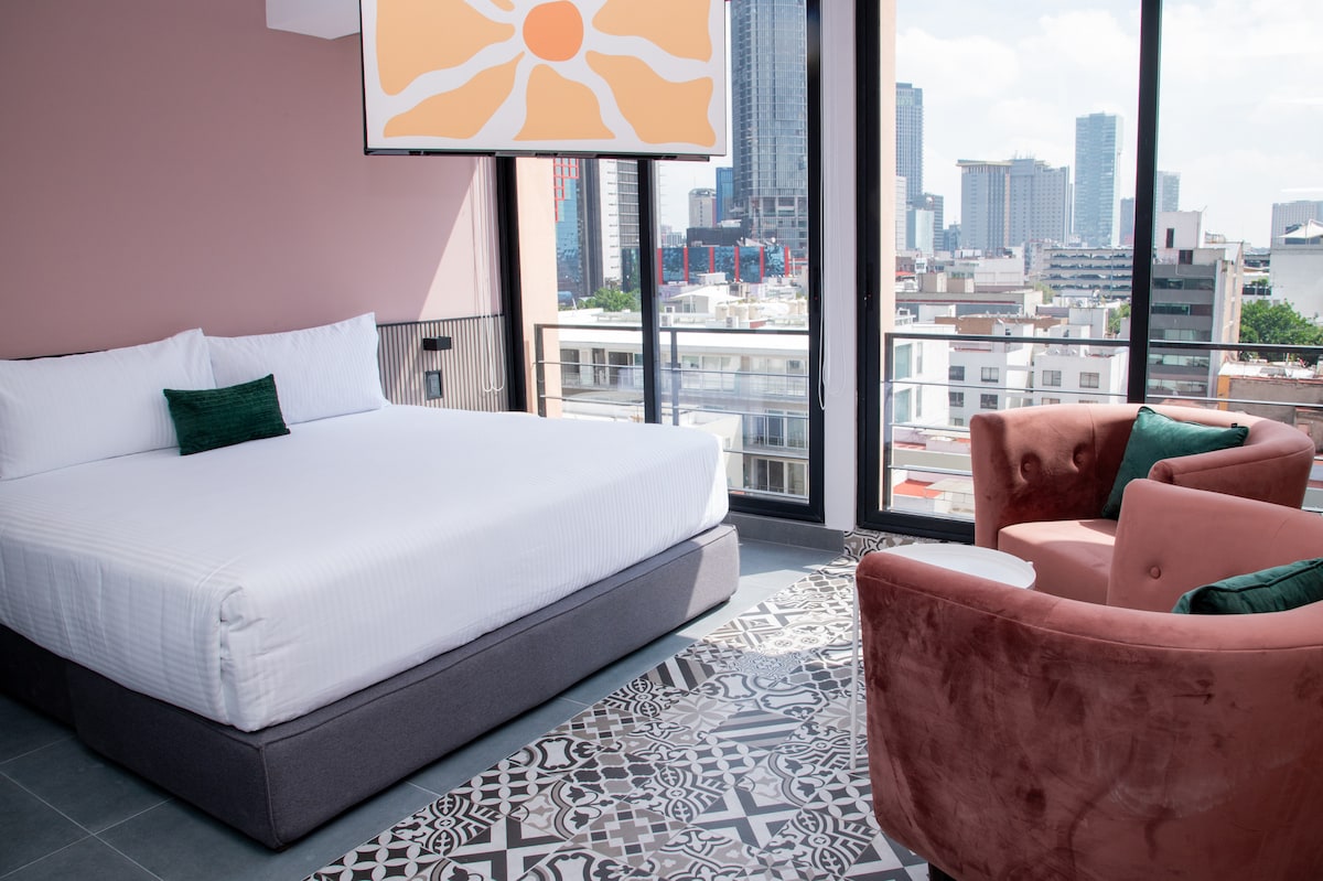 Wake up to the best views of Mexico City. At NIU Reforma, your home in the heart of the capital, our City View Loft with a King bed blends comfort, modern design, and unbeatable location. Enjoy a daily continental breakfast on our rooftop with skyline views. Just steps from Paseo de la Reforma, and close to landmarks like the Angel of Independence, Historic Center, Polanco, and Zona Rosa.