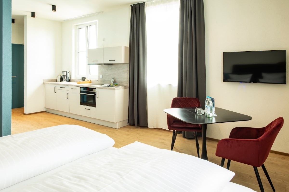 Die My Flats Studio Apartments in Meckenbeuren sind moderne, voll möblierte Studios (40–64 m²) mit hochwertiger Ausstattung – Boxspringbett, Schlafsofa, Küche, Bad mit Dusche/Badewanne, eigener Waschmaschine und Wäschetrockner, unmittelbarer Nähe zum Ravensburger Spieleland und Friedrichshafen. Lage & Umgebung: • Bahnhof Meckenbeuren in nur etwa 5 Gehminuten erreichbar • Ravensburger Spieleland nur ca. 3 km entfernt (ca. 3 Autominuten) • Friedrichshafen Messe in etwa 8 km (9 Min.)