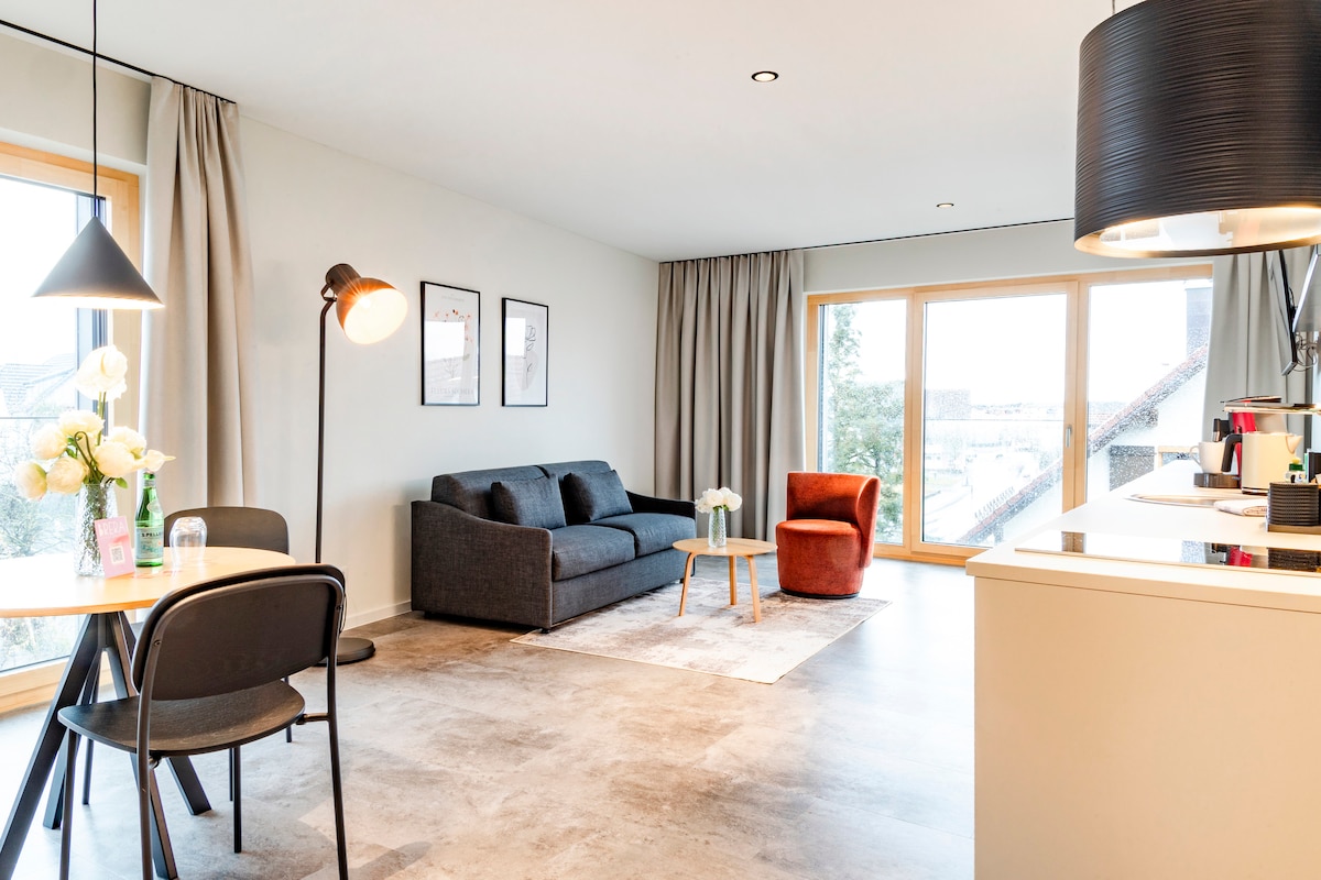 Das moderne Studio Apartment bei Brera Meckenbeuren-Friedrichshafen bietet eine komfortable Unterkunft für Geschäftsreisende und Urlaubsgäste. Es verfügt über ein gemütliches Doppelbett, ein Schlafsofa, einen funktionalen Arbeitsbereich sowie kostenfreies WLAN und einen Flachbild-TV. Das moderne Badezimmer ist mit Dusche, WC und frischen Handtüchern ausgestattet. Dank der ruhigen Lage und der guten Anbindung sind der Bodensee, Friedrichshafen und Ravensburg schnell erreichbar.