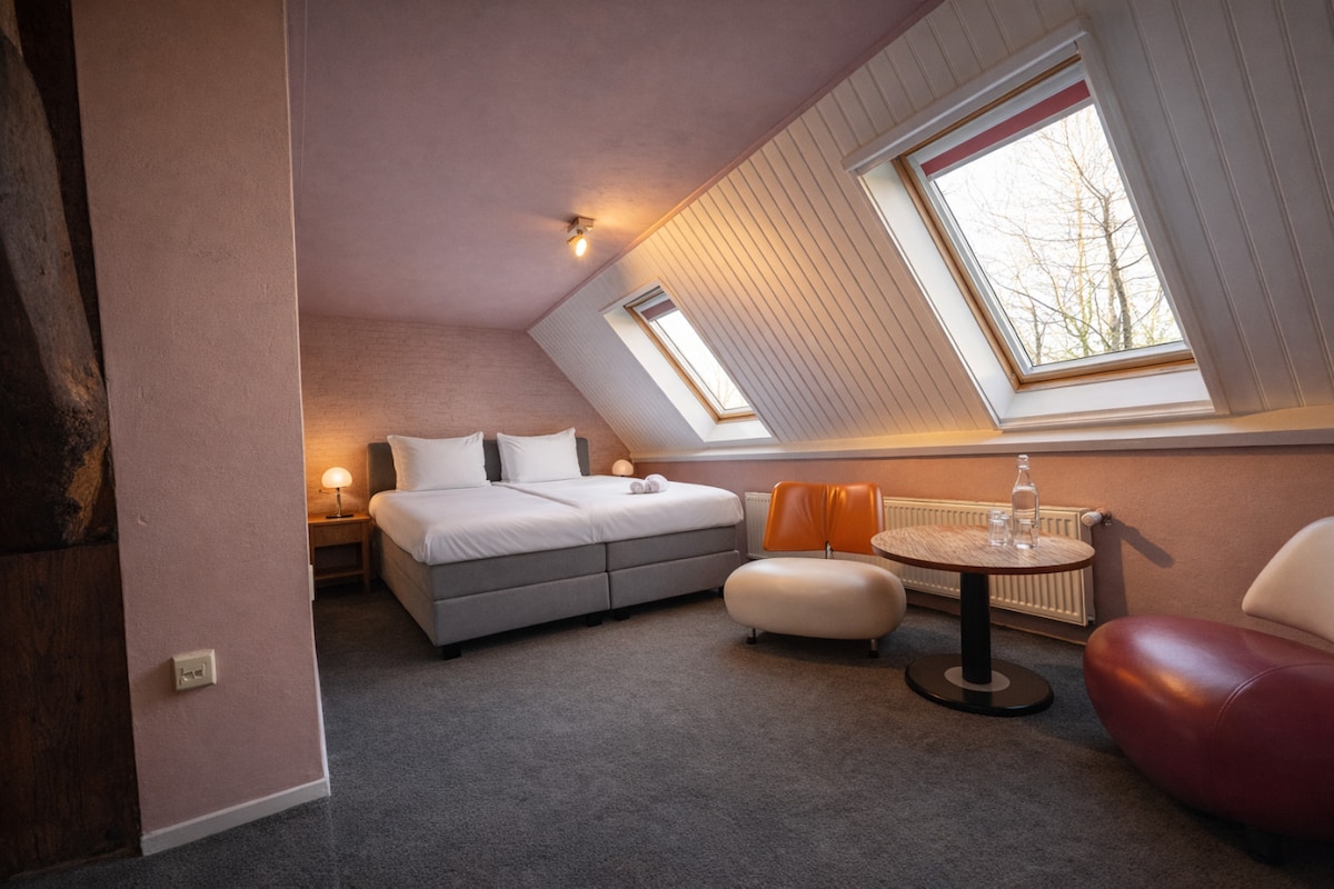 Onze 2-persoonskamer in het Hike & Bike Hotel is de ideale uitvalsbasis voor wandelaars en fietsers, midden in de natuur van Friesland, Drenthe en Overijssel. De kamer is comfortabel en modern ingericht met een luxe bed, privébadkamer, kleine koelkast, koffiezetapparaat en theekoker, inclusief gratis koffie en thee. Of je nu de omgeving verkent per fiets of te voet, of gewoon even helemaal tot rust wilt komen, deze kamer biedt alles voor een comfortabel verblijf.