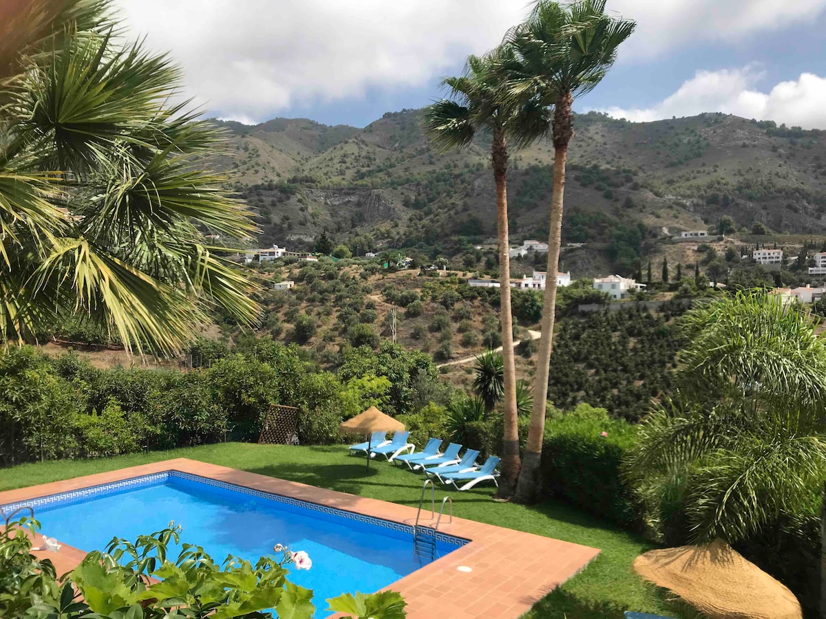 Villa muy luminosa,en un entorno de playa y montaña, urbanización tranquila. Construcción reciente. Cuatro habitaciones amplias, todas con baño independiente. Cuna para niños. Cocina equipada. Dos grandes salones. Lavadora. Grandes terrazas con barbacoa. Garaje para dos coches. Antena parabolica. Wifi. TV cable/Satélite. Aire acondicionado. Chimenea. Mesa de Ping-Pong, juegos . A 30 min. de Málaga, 10 min. de Nerja y 5 min. de Frigiliana. Idiomas: Inglés, Francés, Alemán, Español, Neerlandés.