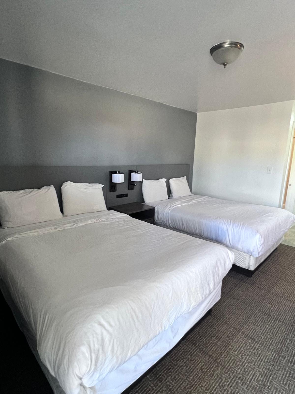 2 double XL-size beds with plush bedding, fast Wi-Fi, Smart TV w DirecTV Premium NFL Package, refrigerator, microwave, and work desk. Free breakfast, barbecue pit, ice machine, next to food and stores. Enjoy the rain shower head in the en-suite bathroom equipped with a full array of toiletries and soft towels. Newly renovated, friendly front desk, excellent service, open to long-term stays. Come stay with us today!