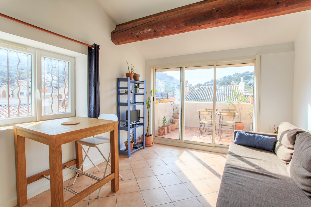 Charmant studio de caractère très lumineux ,calme et indépendant situé en hauteur au dessus de la maison du propriétaire . Une vaste salle d eau avec wc . Une penderie . Une cuisine ouverte équipée .2 lits de 90 modulables à souhait (petit matelas supplémentaire si enfant . )Compagnons à 4 pattes sont bienvenus . À 100 m de la mer .ballades dans les calanques . Il est préférable d être véhiculé mais la gare Sncf est accessible à pieds