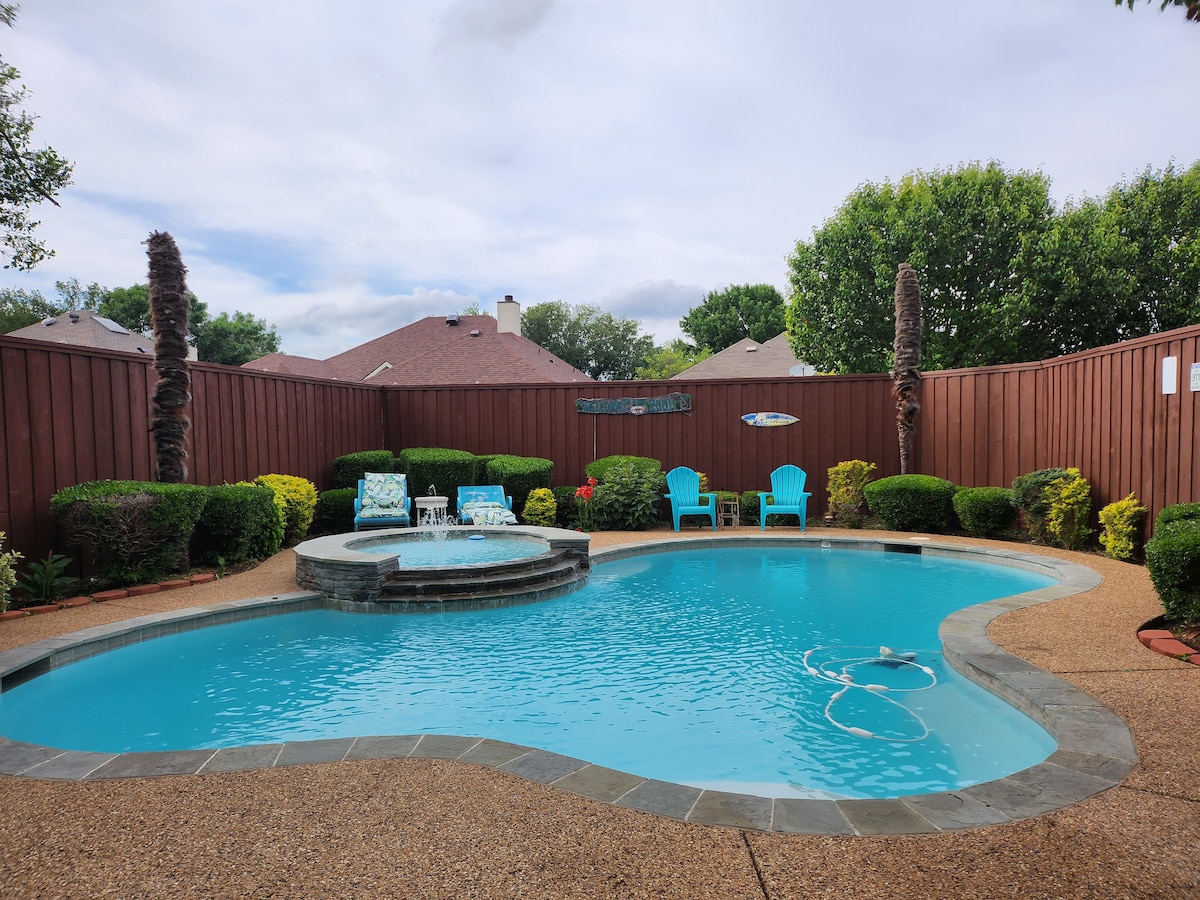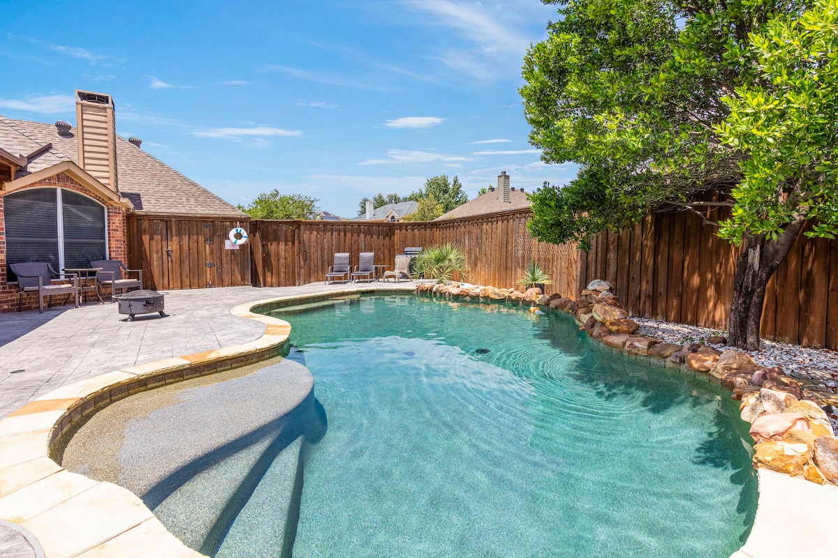 Welcome to your outdoor patio and pool oasis! Relax with friends under the large covered patio, watch your favorite sporting event poolside on a 55" Smart TV and BBQ after a day in the sun. The backyard is very private with 8ft privacy fence. You won't want to leave this outdoor space, but if you must we are located conveniently off of 121 just minutes away from: Stonebriar Mall, Dr Pepper Stadium, The Star, Legacy West, The Grandscape and Toyota Headquarters.