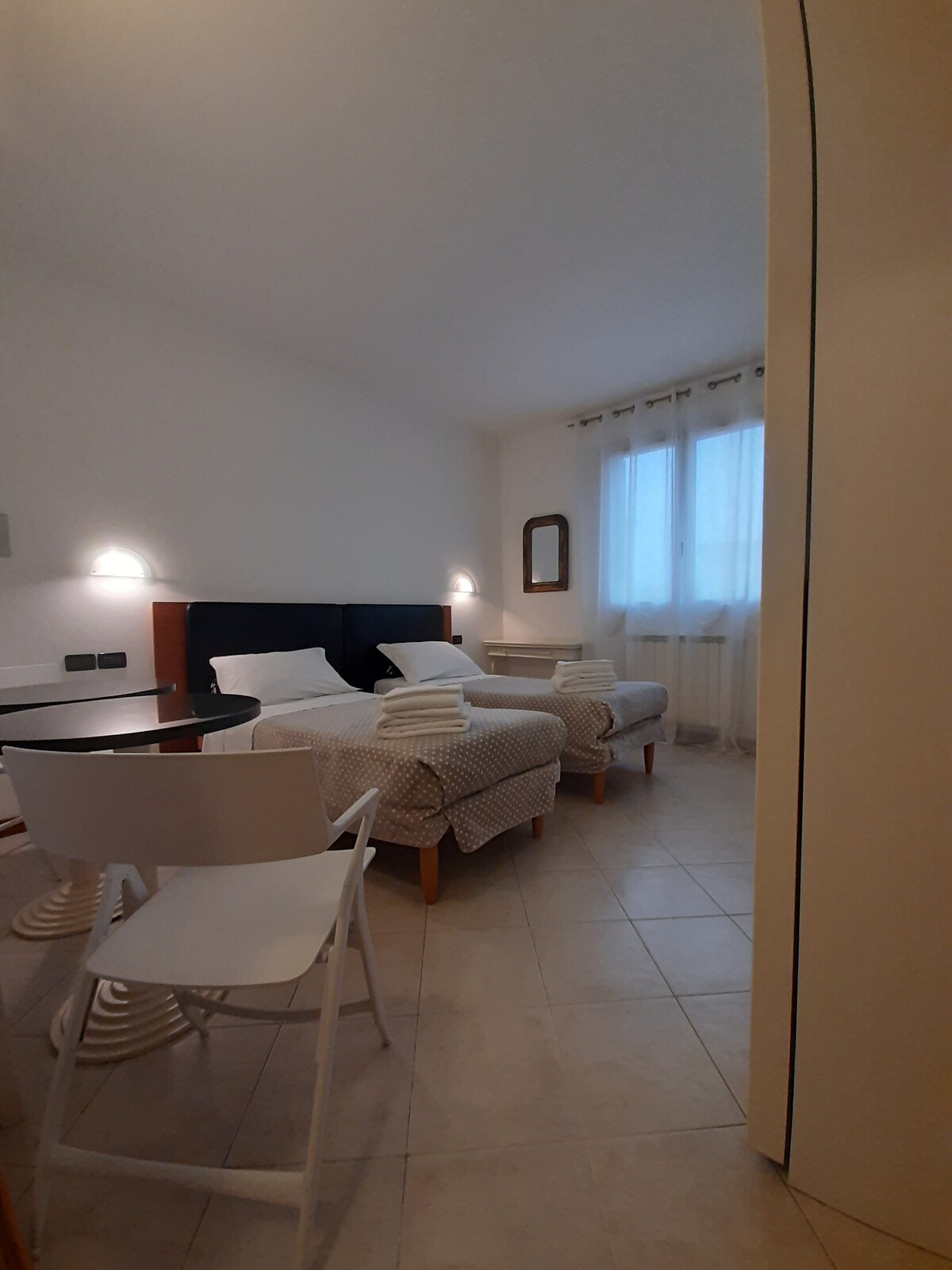 Confortevole sistemazione in due camere con bagno privato Ideale per due persone che viaggiano e desiderano dormire ognuno in una camera con letto matrimoniale, condividendo tra loro il bagno e l'angolo dove trova posto un tavolo con sedie,frigorifero,bollitore,forno microonde,lavello. Tavolo con sedie anche nel patio esterno. WI-fi , parcheggio interno privato,ingresso indipendente,climatizzazione. corredato di lenzuola e asciugamani.