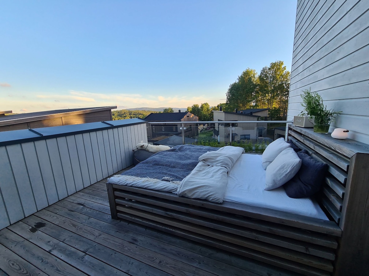 Modern cabin, with open kitchen, large south-west facing terrace overlooking the fjord. Cozy fireplaces. 2 min walk to beach & pier. Tiled floors are heated. Chilly evenings are lovely in wood fired hot tub. Near fishing village Drøbak and Oslo (40 min by car). Great view from the hammock and terrace. Private. Excellent for running, road and single track biking. Trampoline and dolls house. Beds are made, towels and firewood included (in contrast to many Airbnbs in Norway).