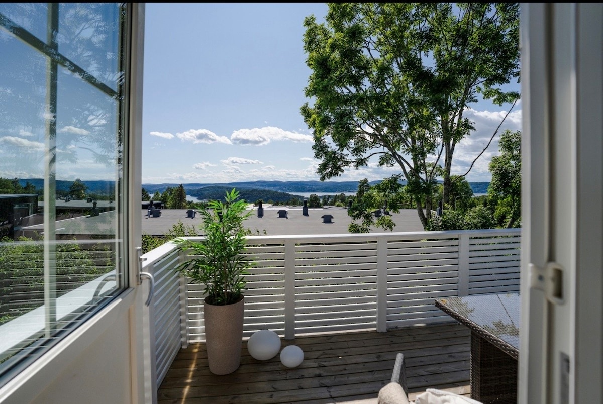 Modern cabin, with open kitchen, large south-west facing terrace overlooking the fjord. Cozy fireplaces. 2 min walk to beach & pier. Tiled floors are heated. Chilly evenings are lovely in wood fired hot tub. Near fishing village Drøbak and Oslo (40 min by car). Great view from the hammock and terrace. Private. Excellent for running, road and single track biking. Trampoline and dolls house. Beds are made, towels and firewood included (in contrast to many Airbnbs in Norway).