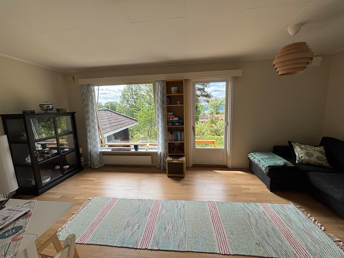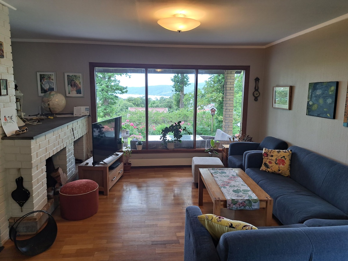 Vi leier ut 1.etasje i boligen vår. Leiligheten har to soverom, stue med spiseplass og to sitteavdelinger, den ene med tv, den andre med utsikt over Oslofjorden og Oscarsborg, eget kjøkken og bad/do med badekar og vaskemaskin. Ca. 105 kvm. Boligen ligger i et rolig hytteområde med nærhet til både skog og sjø. To uteplasser er tilgjengelige fra leiligheten. Kort avstand til Seierstenmarka. 12 min. gange til badeplass ved fjorden. 1,5 km til bussholdeplass. 2 km til til sentrum.