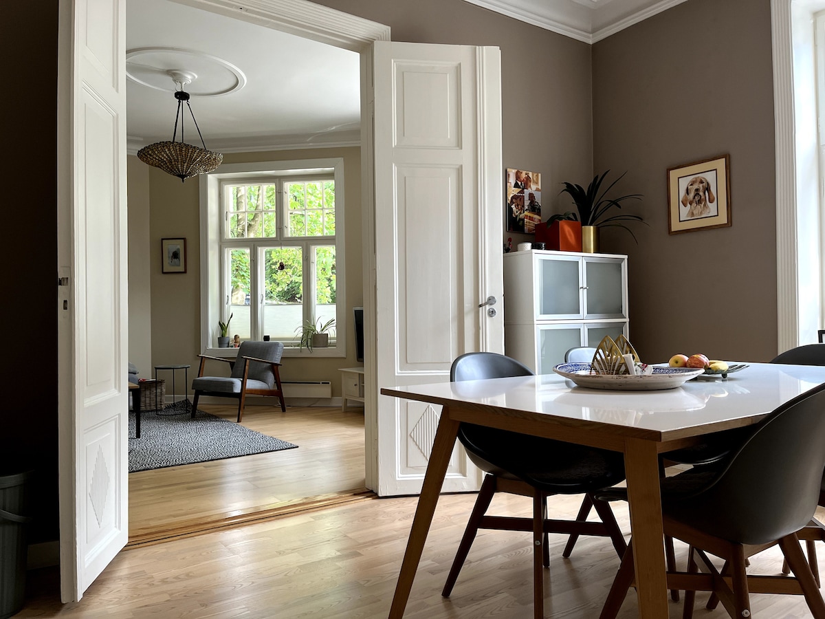 Classic apartment in nordic design. Facing a quiet garden w/flowers and fruittrees. A beautiful vibrant neighbourhood. Spacious livingroom: TV w/chromecast, fireplace, table for dinner & work. Sofa. Kitchen: Dishwasher, washingmachine, supplies for cooking and baking, Moccamaster, french press, coffegrinder, kettle. Bedroom 1: Double bed 160x200 Bedroom 2: 2 beds 90x200 / bunk for adults Small functional bathroom. For your baby: High chair, travel cot, changing pad, stroller.