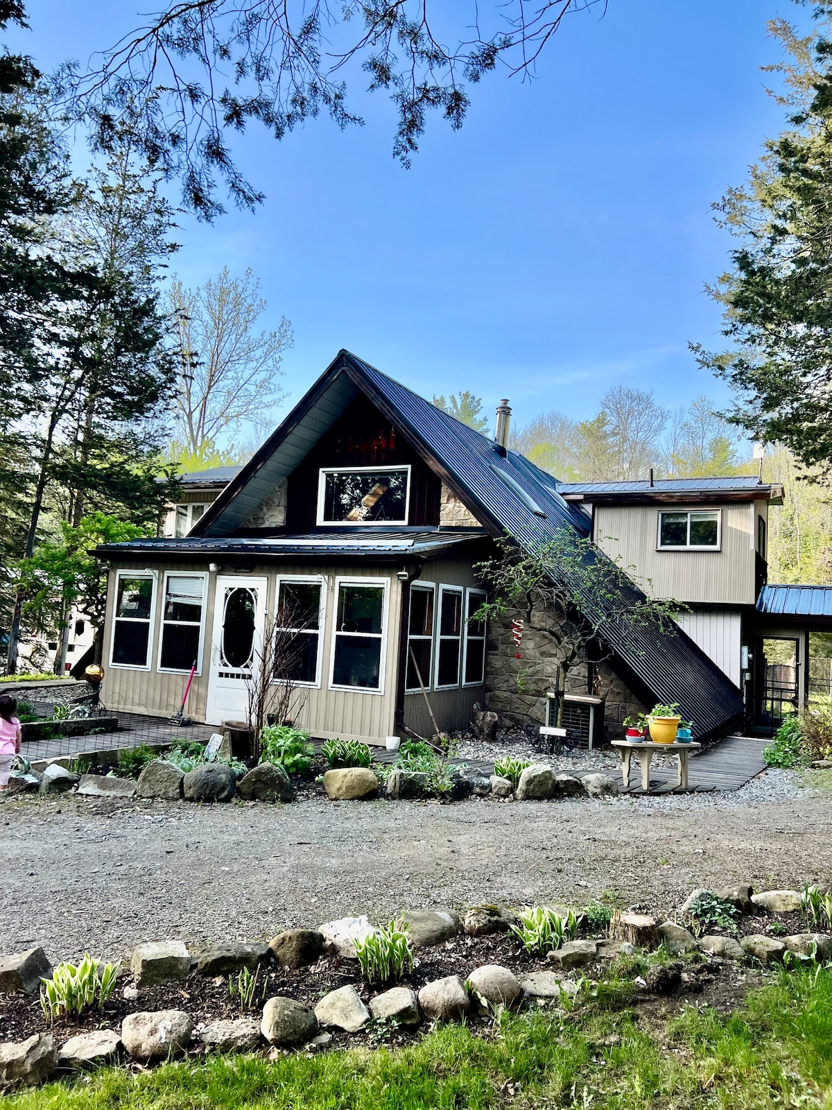 The Evergreen is a cozy, modern 4-season log home with 2 bedrooms & an office. This family home boasts open-concept living and a tranquil 2.5-acre private yard with a hot tub! Fire pit, above-ground pool, BBQ and screened-in gazebo open seasonally. The Evergreen is a safe, inclusive space where everyone is welcome! This is an older home, not a hotel; we love its imperfections and we hope you do too! Firewood not included, BBQ unavailable in winter months. Our pool reopens in late spring 2025.