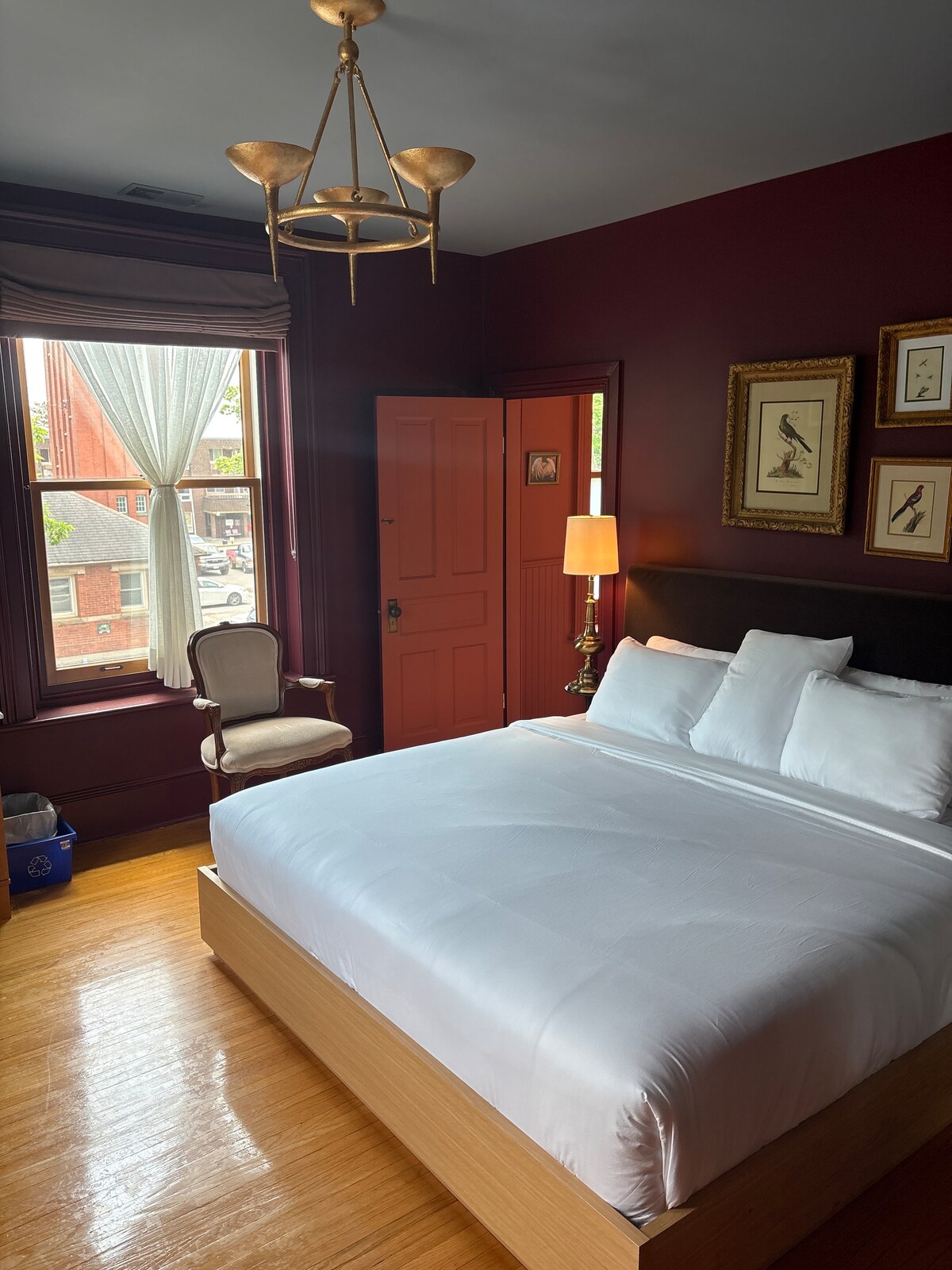A well appointed dark oak wood trim bedroom. Very comfortable Queen sized 4 poster bed ... electric fireplace..baseboard heat as well .. Air conditioner...comfortable seating... Blackout curtains for a comfortable sleep.. 2 shared washrooms on the second floor and a 3rd washroom on the first floor.... patio access .. Lounge and and after hours dining room acess.... free parking... snack bar included and a continental breakfast. bar fridge in toom&kitchenette.. Kuerig . microwave.etc