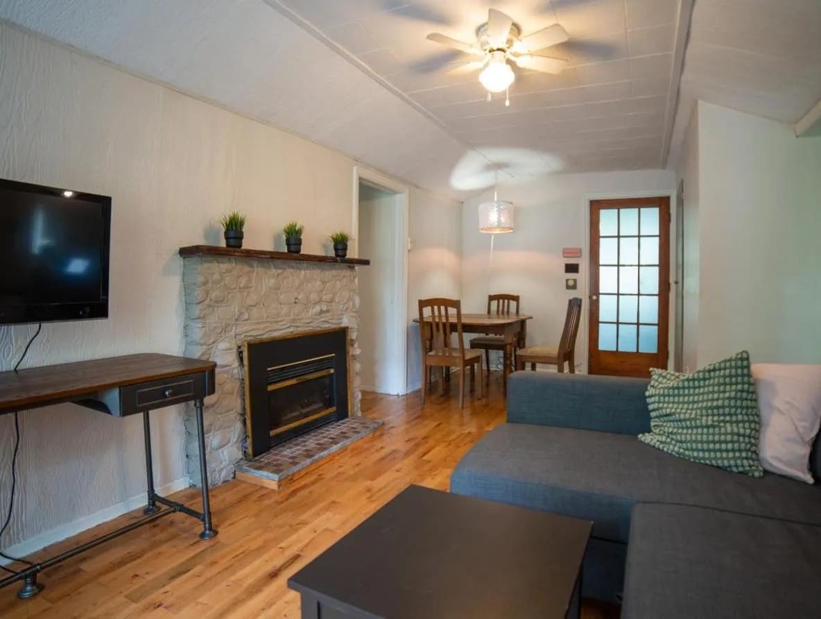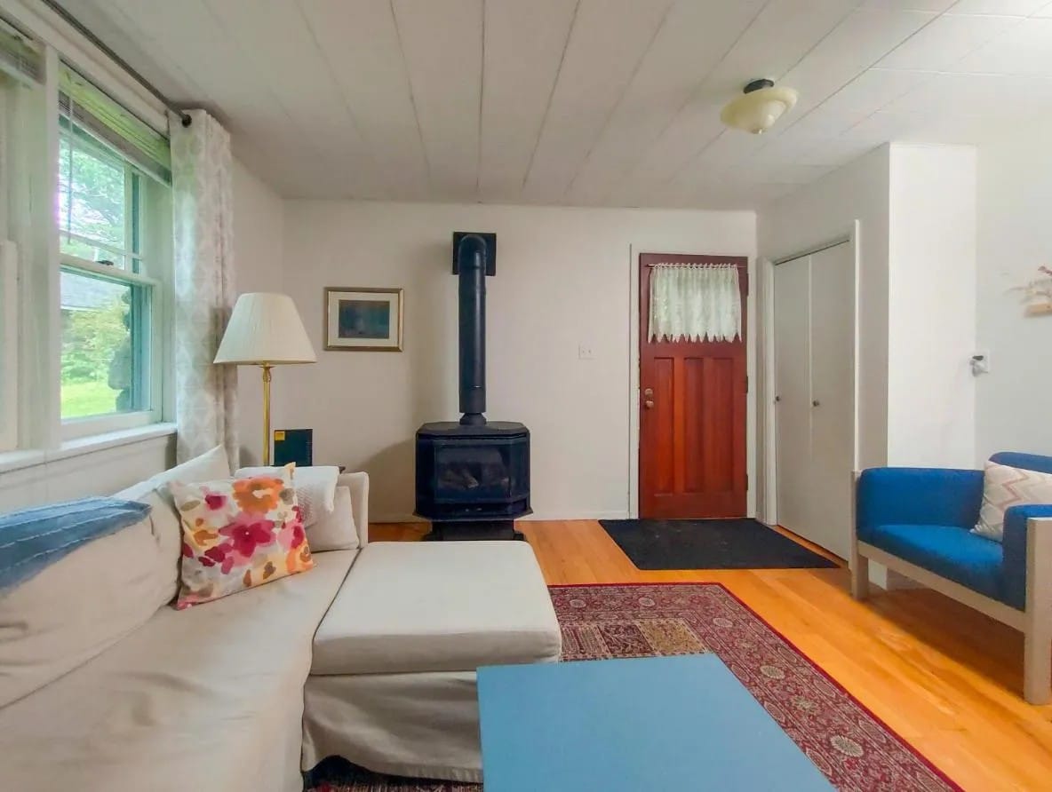 The Evergreen is a cozy, modern 4-season log home with 2 bedrooms & an office. This family home boasts open-concept living and a tranquil 2.5-acre private yard with a hot tub! Fire pit, above-ground pool, BBQ and screened-in gazebo open seasonally. The Evergreen is a safe, inclusive space where everyone is welcome! This is an older home, not a hotel; we love its imperfections and we hope you do too! Firewood not included, BBQ unavailable in winter months. Our pool reopens in late spring 2025.