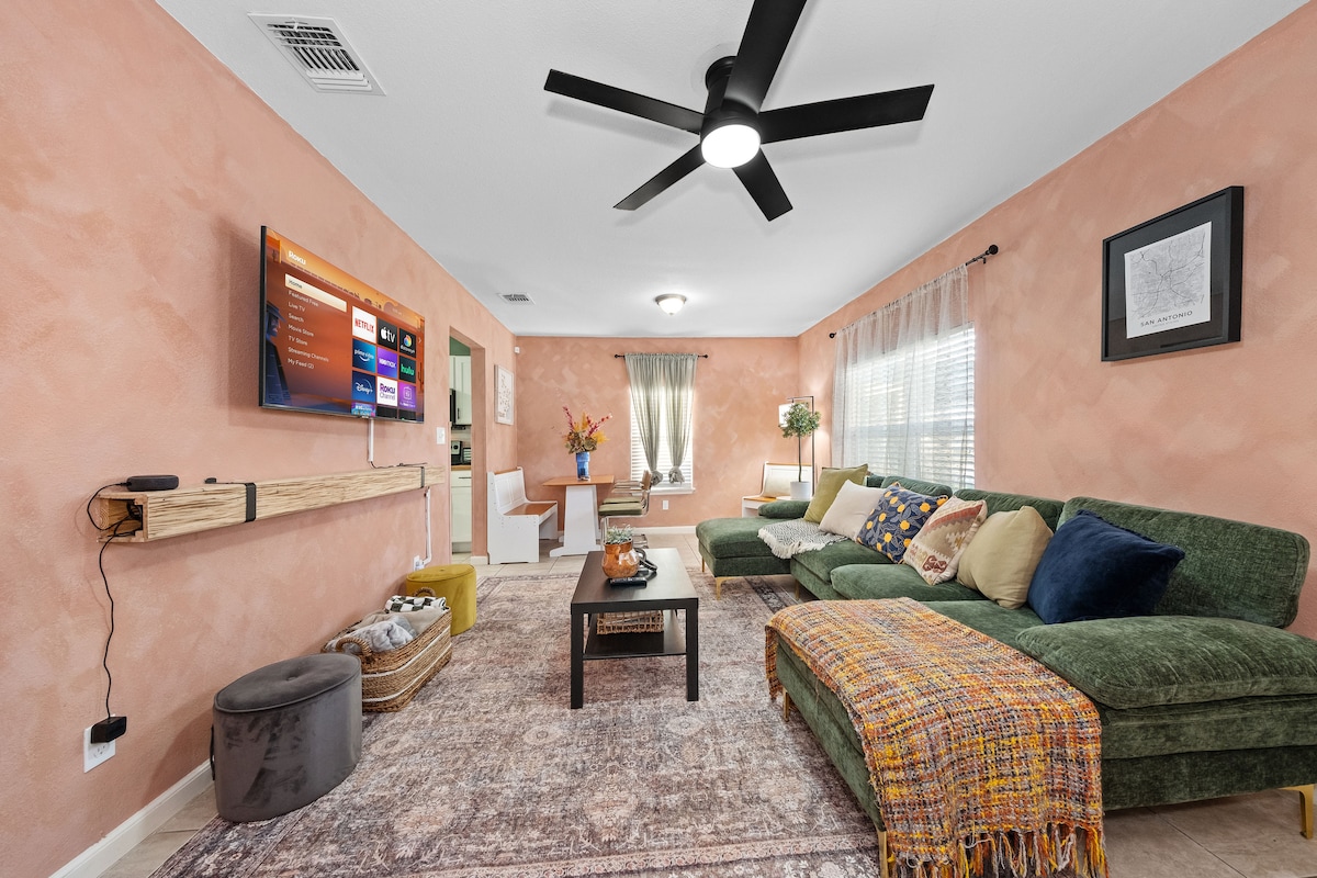 Modern, vibrant, and full of natural light, this spacious home sits just east of San Antonio—walking distance to the Frost Bank Center, Freeman Coliseum, and Expo Hall. Pre-game at home, then stroll to a concert, Spurs game, rodeo, and more. Afterward, walk right back and relax. You're also just a 5-minute drive from downtown attractions like the Riverwalk, Alamodome, and Convention Center. Perfect for fun, convenience, and a true San Antonio experience!