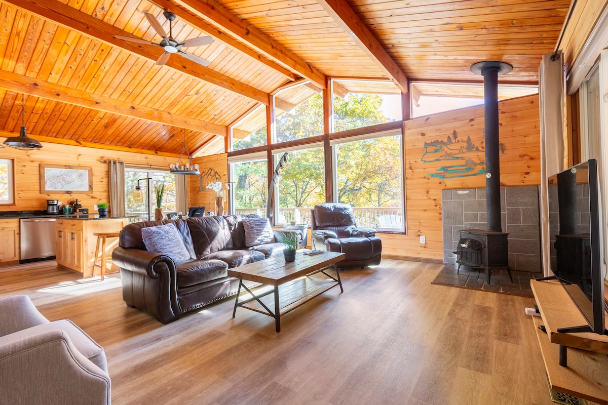 Wake up to mountain views at our modern-rustic A-frame cabin, a peaceful retreat for couples, families, or two couples. Gather around the dining table with picture-window views, relax on the sunny tree-top deck, or unwind by the wood-burning stove after a day exploring the Blue Ridge Mountains. Renovated by us with an industrial-rustic feel, The Tree House is centrally located near Hendersonville, Flat Rock, DuPont State Forest, Brevard, Asheville, and the Blue Ridge Parkway. Fast Starlink WiFi.