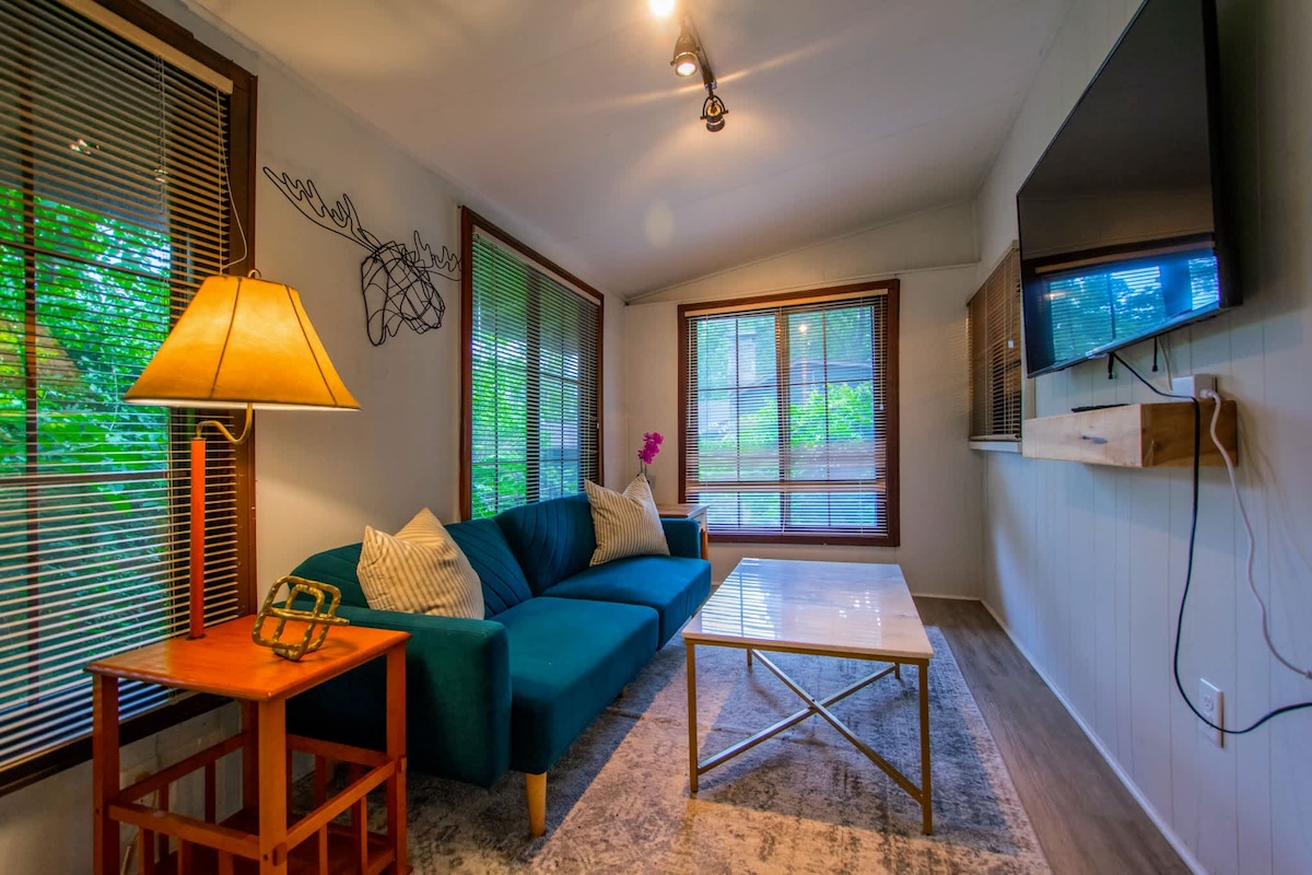 Come unwind and breathe at our couples mountain spa retreat. Atrium House has been designed to feel open to the lovely mountain surroundings yet let you relax in privacy. Our outdoor therapy hot tub, indoor/outdoor gas fireplace, and spacious two-person, walk-in shower make for a getaway so tranquil, you may never make it in to nearby Asheville! We're out in the country but just over a 15-minute drive from downtown Asheville, Biltmore, Hendersonville, Asheville Airport, and dozens of breweries.