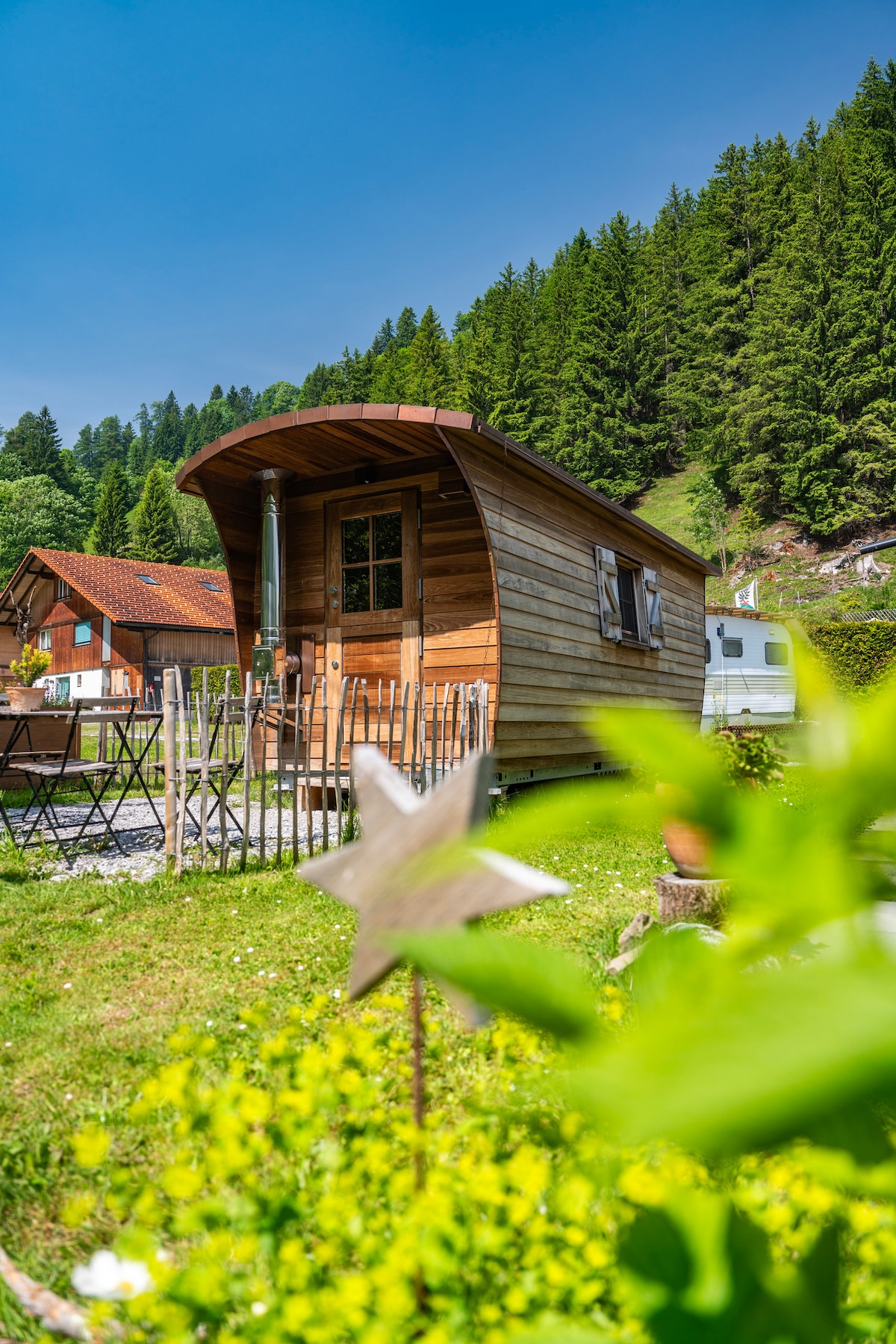 Einige AirBNBs bieten nur eine Unterkunft, damit Sie Ihr Ziel erreichen, aber diese Jurte IST das Ziel Die Jurte ist extrem einladend und komfortabel, von der geschmackvollen Einrichtung bis zur Nespresso-Maschine: Chuen hat diesen Ort perfektioniert. Wir haben besonders den Holzofen genossen und das nordische Bad geliebt (ein Muss). (Auszug aus einer Bewertung von einem Gast) Eine wichtige Information für Gäste: Das Bad wird mit anderen Gästen geteilt!