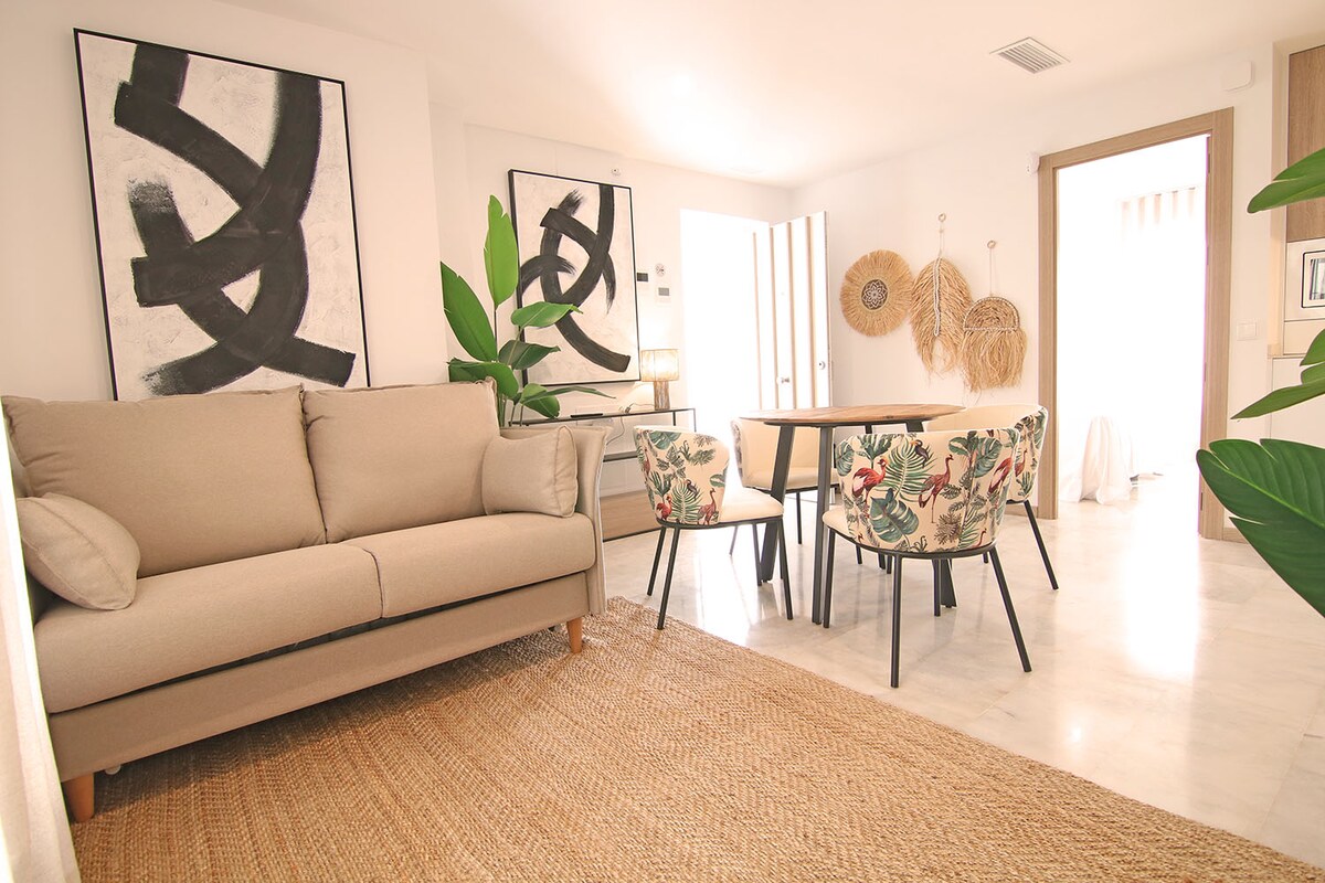 This charming apartment is located on the ground floor of an Andalusian house. It's fully equipped to the highest standard, including King Size bed, linen, 100% cotton towels for bath and pool, complete kitchenware, air conditioning, flat screen TV, free WiFi internet access, hair dryer, common laundry room and ironing equipment. The living room is equipped with a dining area for 3 and seater sofa convertible into a comfortable bed for one guest. Finest quality to make you feel like at home.
